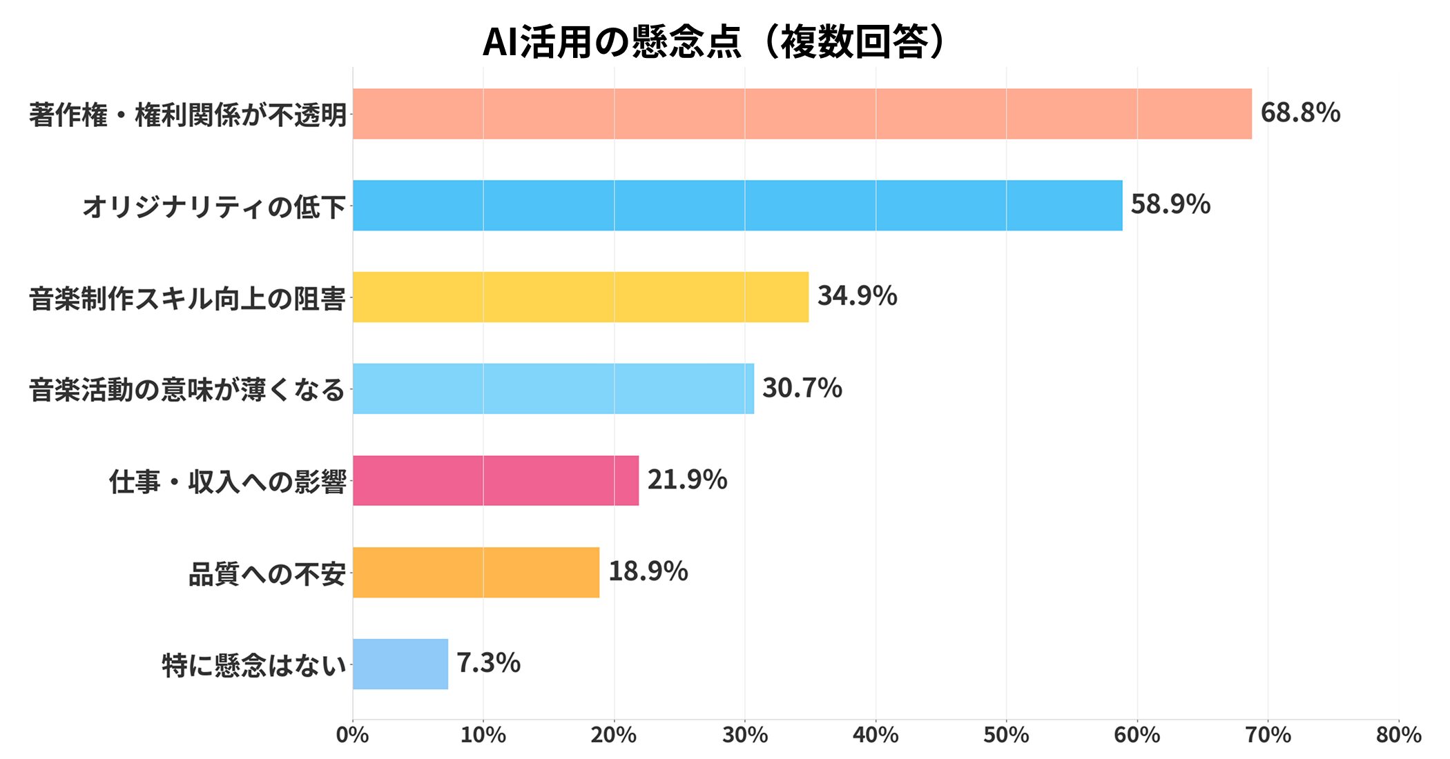 最も多かったのは「著作権・権利関係が不透明」で68.8%、次いで「オリジナリティの低下」が58.9%。