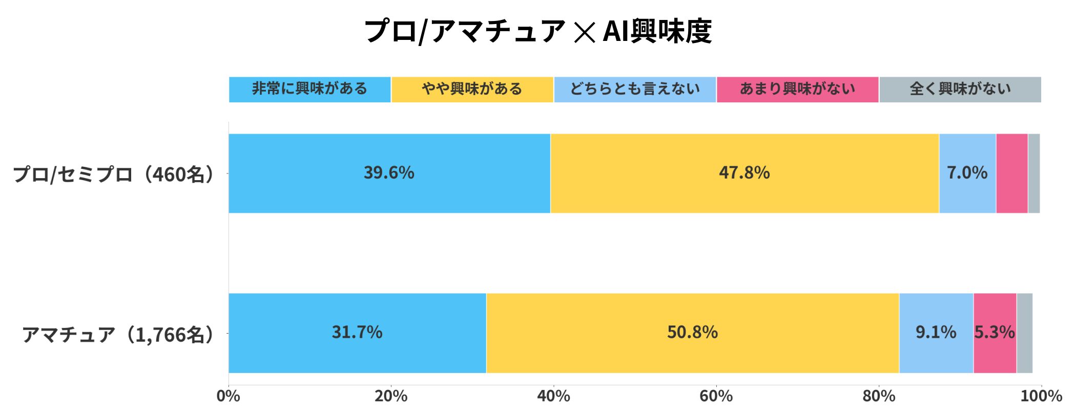 懸念を持ちながらも、プロの方がAIへの興味度が高い(87.4% vs 82.5%)という結果に。