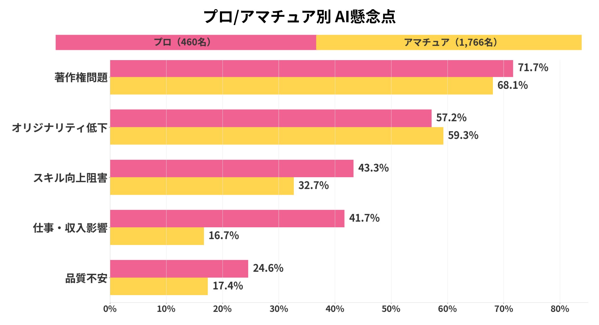 一方「オリジナリティ低下」については、プロもアマチュアもほぼ同等の懸念を持っています。