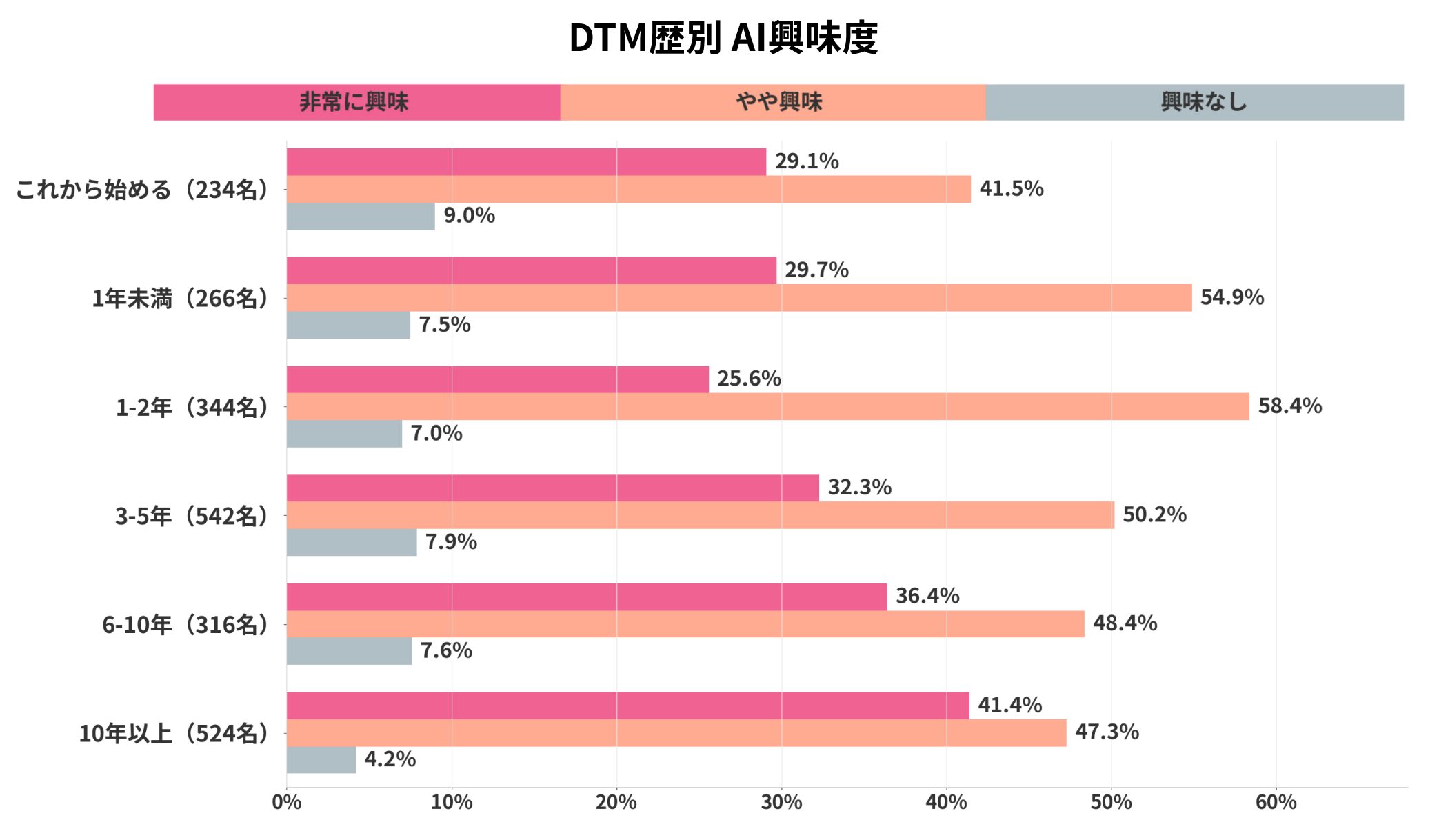 DTM歴10年以上のベテラン層は「非常に興味がある」が41.4%と最も高く、「興味なし」は4.2%と最少。