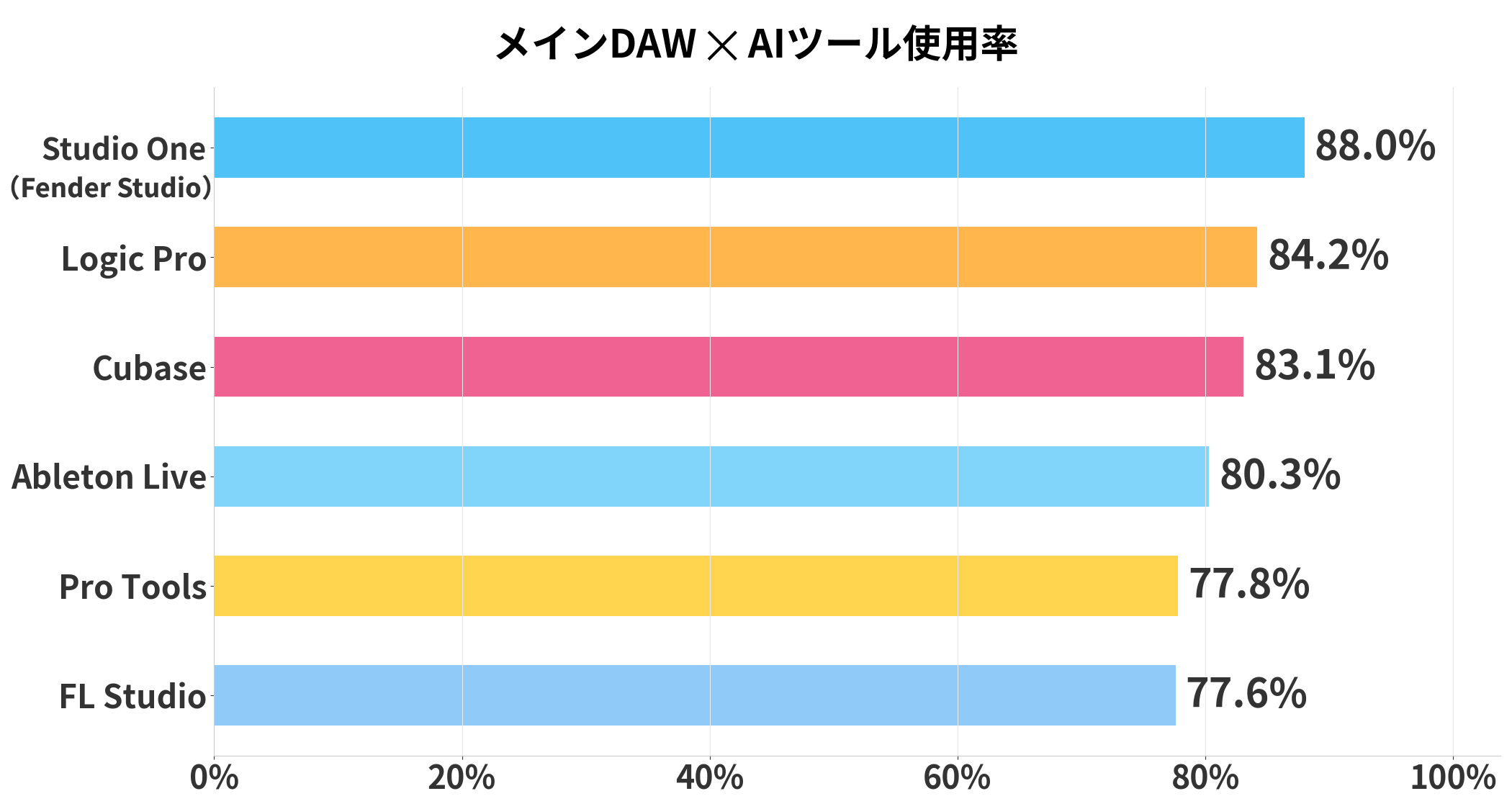 DAW別のAIツール使用率では、Studio Oneユーザーが88.0%でトップ。
