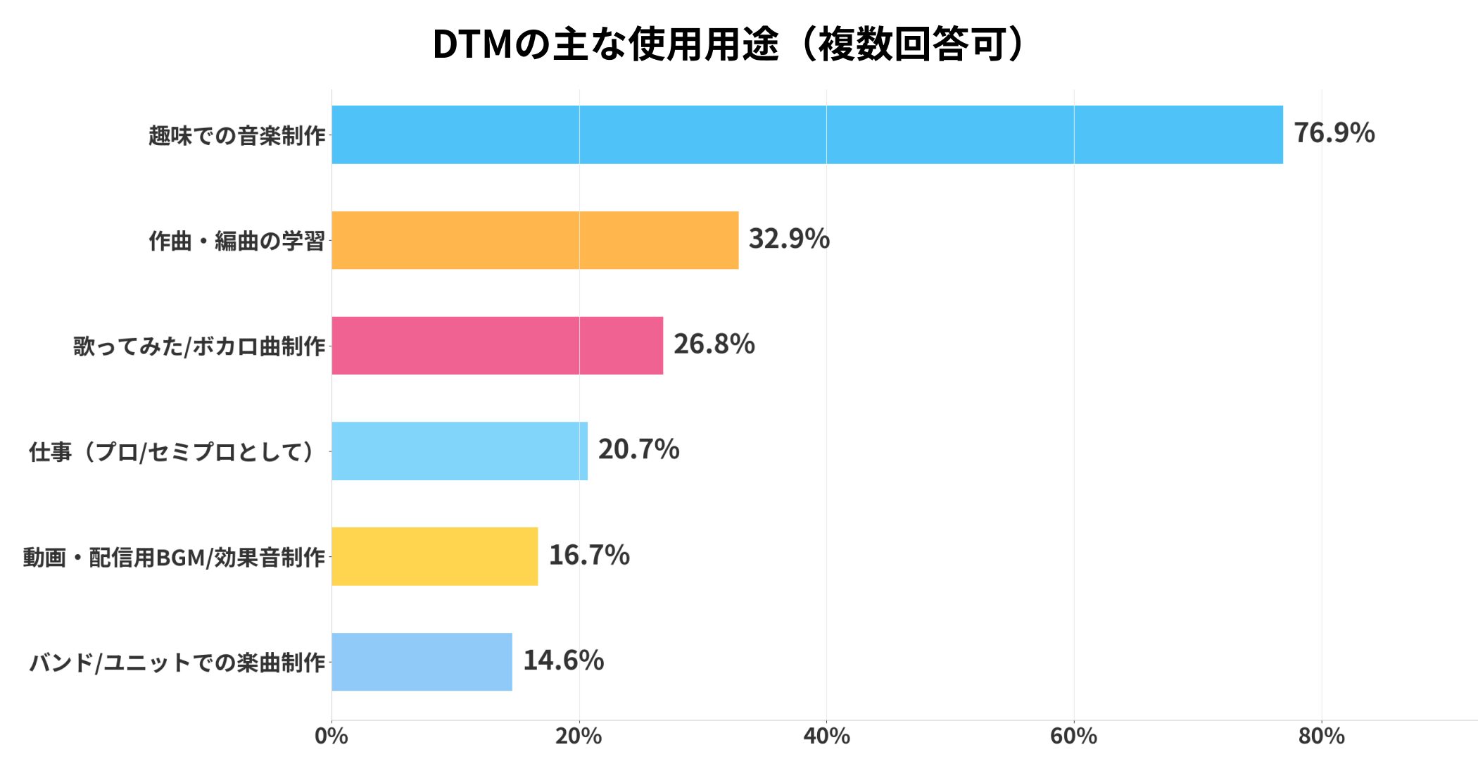 「全て楽しい」という回答も20.2%あり、DTMそのものを楽しんでいる層の存在も確認できます。