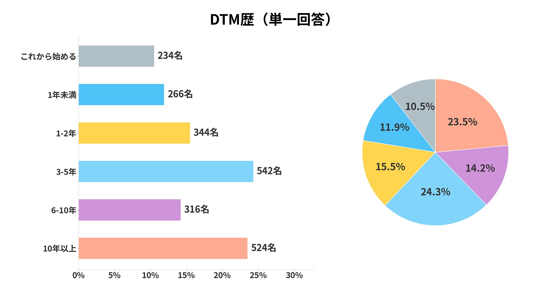 DTM歴は3年以上が62%を占め、中級者〜上級者の回答が多い傾向。