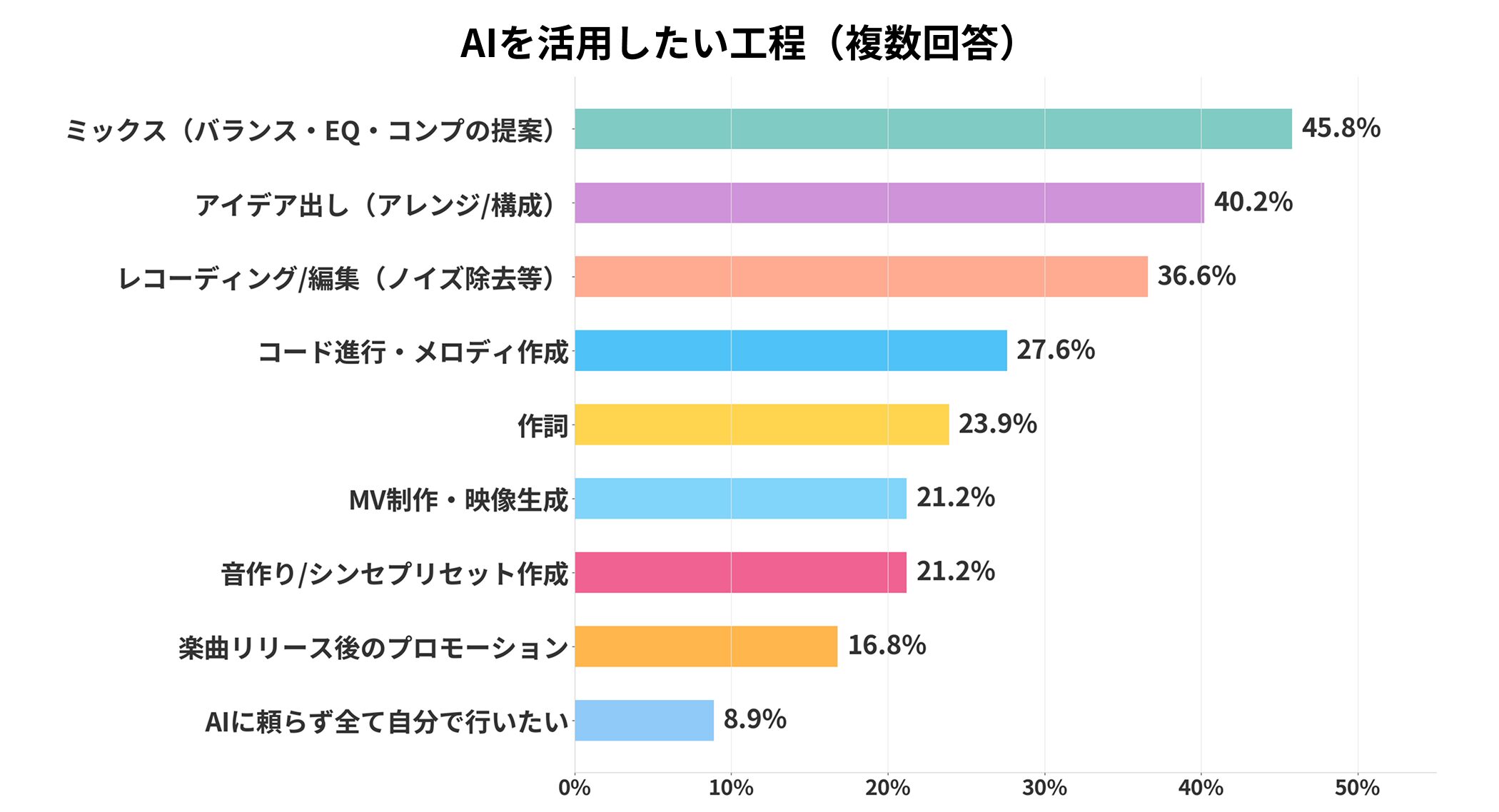 AIを使用している、または活用したい方への質問では、ミックス/マスタリングが45.8%でトップ。