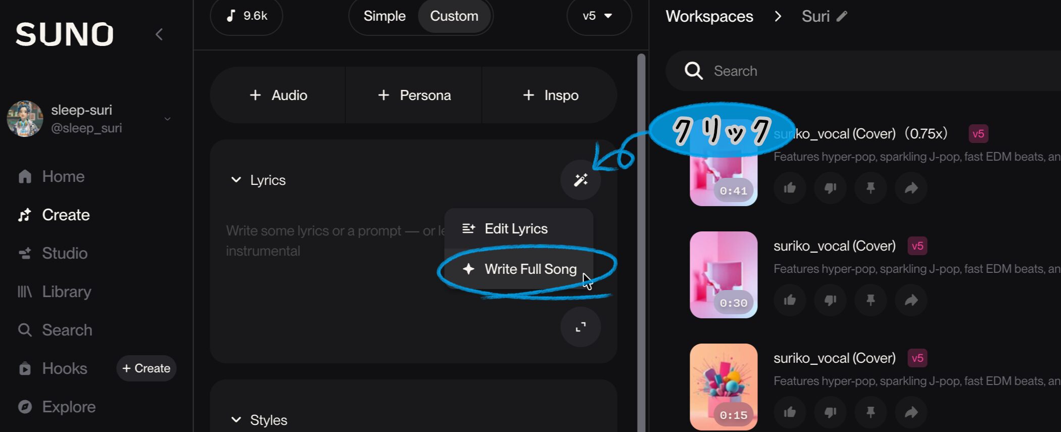 それじゃあ、実際にSunoで楽曲を作る手順を紹介していくね。