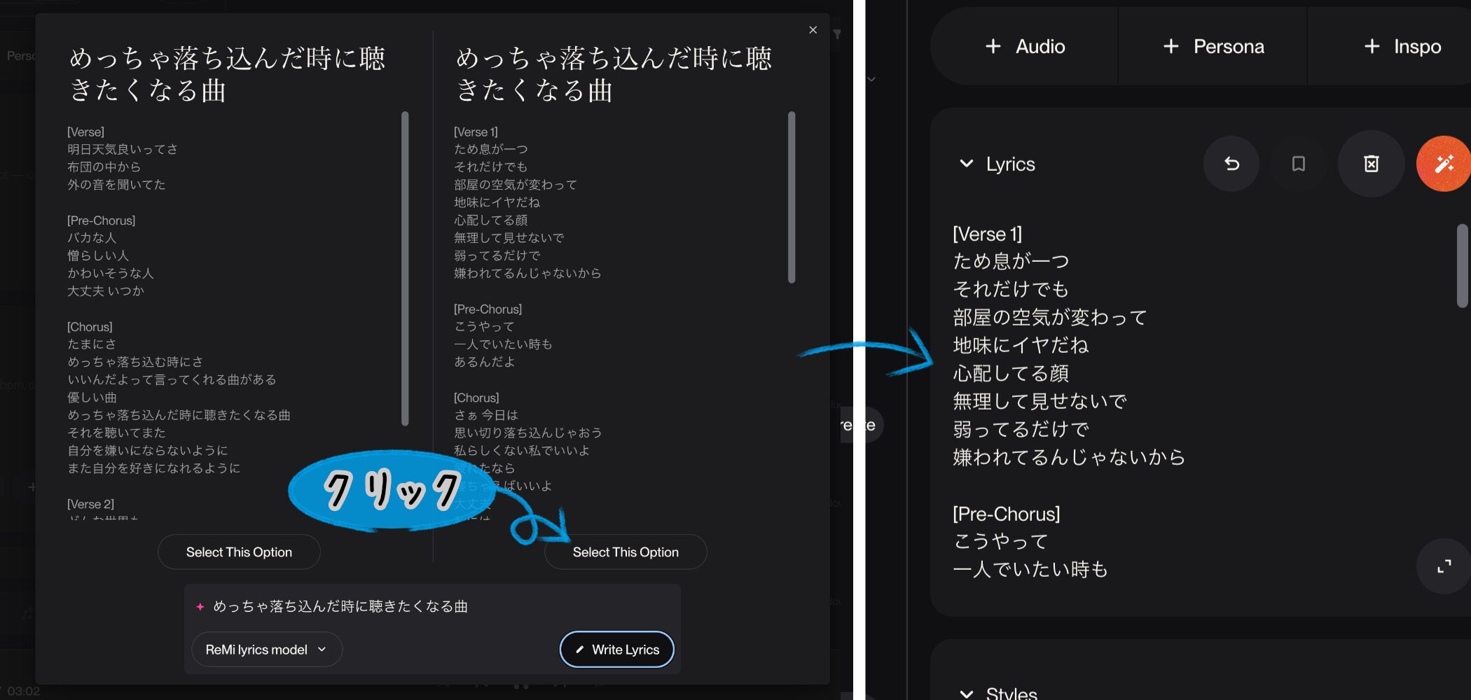 - Use Styles & Lyrics:歌詞やスタイル設定は同じまま、AIに全く別のメロディを生成させる機能。