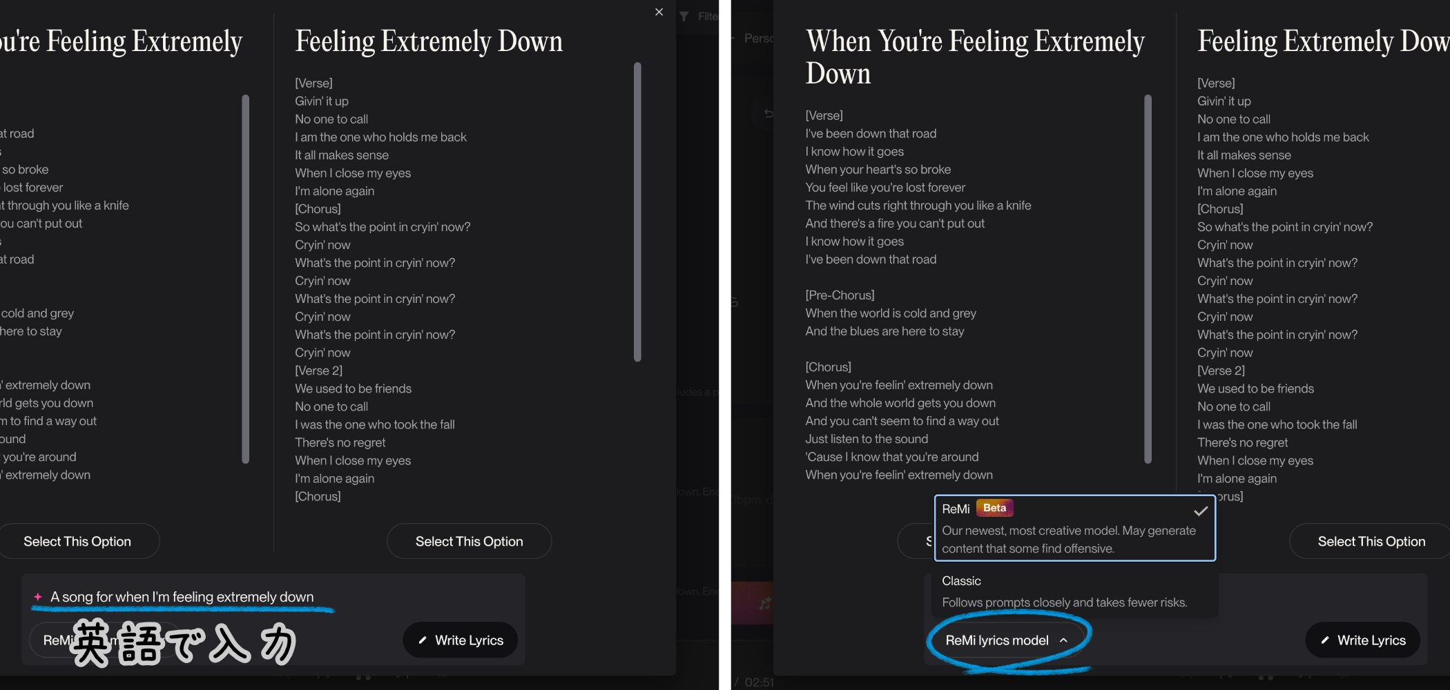 - モデル選択:歌詞を作るAIモデルも選べて、最新の「ReMi」モデルだと、より自然で創造的な歌詞が作られるんだって。(有料プラン限定)