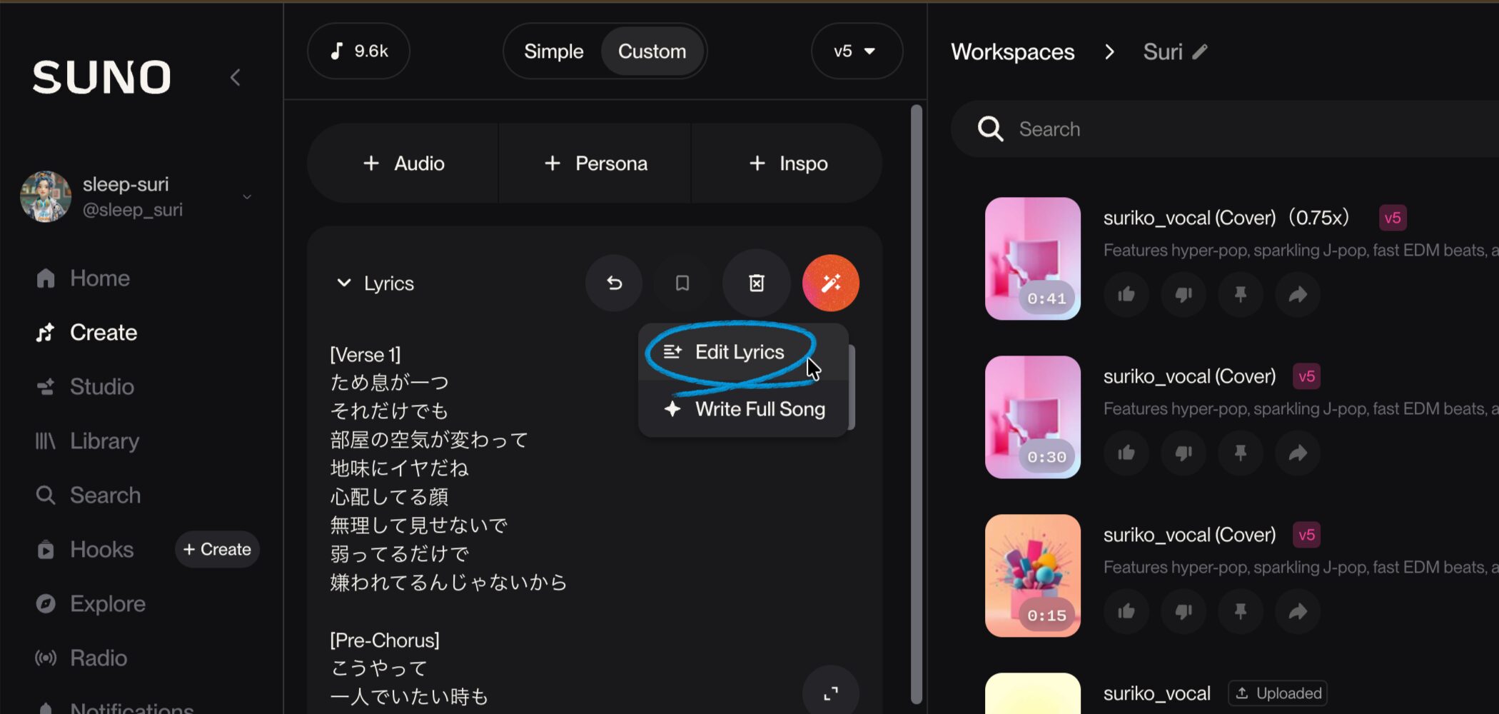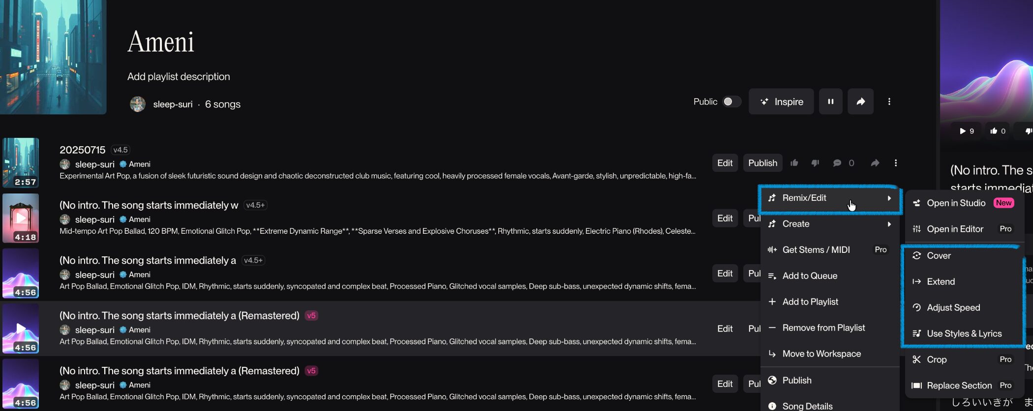 Sunoには、作った楽曲をもっと細かく編集できる機能もあるんだよね。