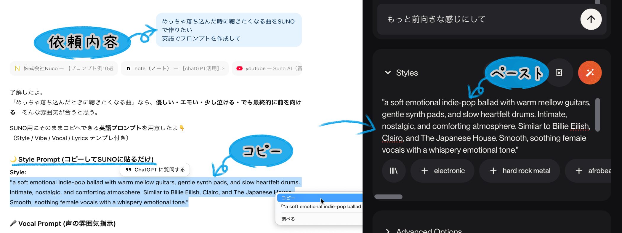 AIにプロンプト作成をお願いするときに、“インスト曲を作りたい”って伝えれば、追記もチェックもしなくていいプロンプトを作成してくれるよ!