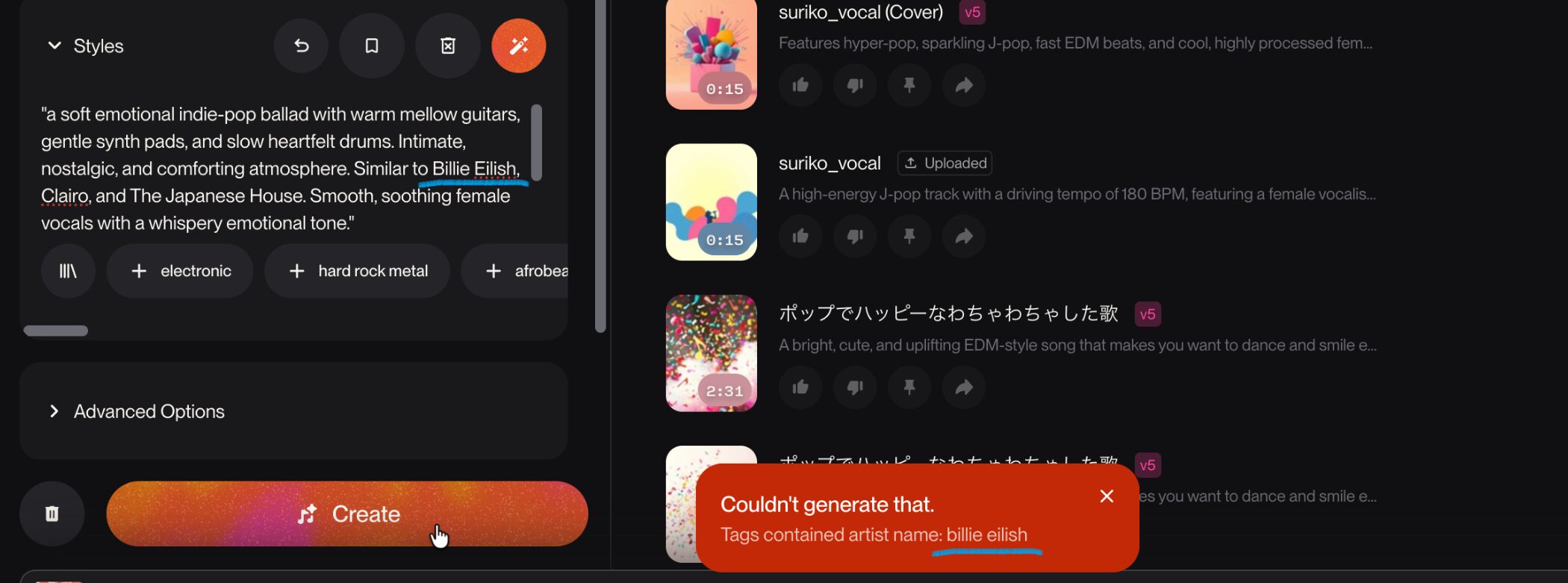 ただ、ここでちょっと注意!プロンプトに実在するアーティスト名が入ってると、警告が表示されて曲が生成できないの。
