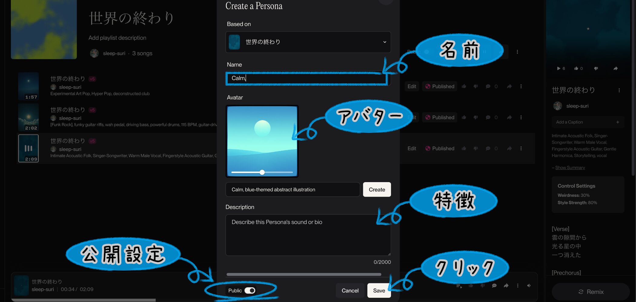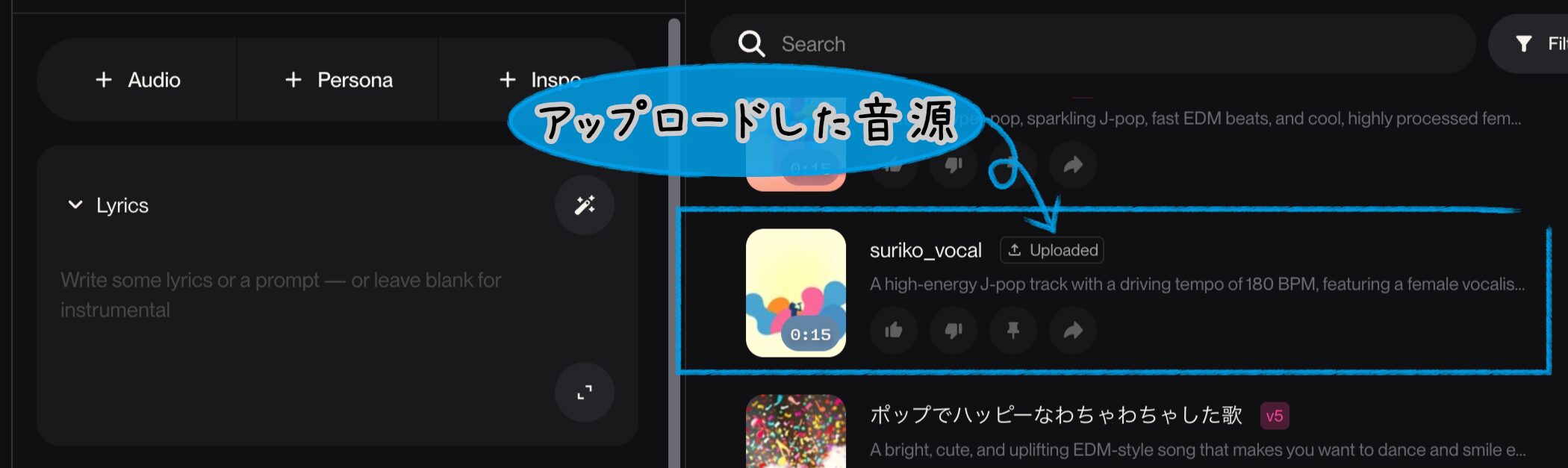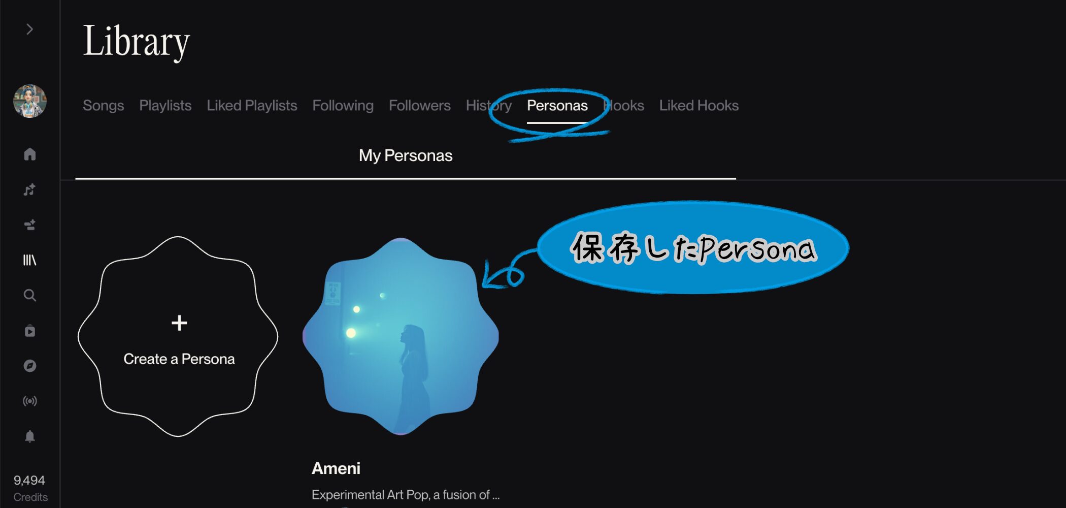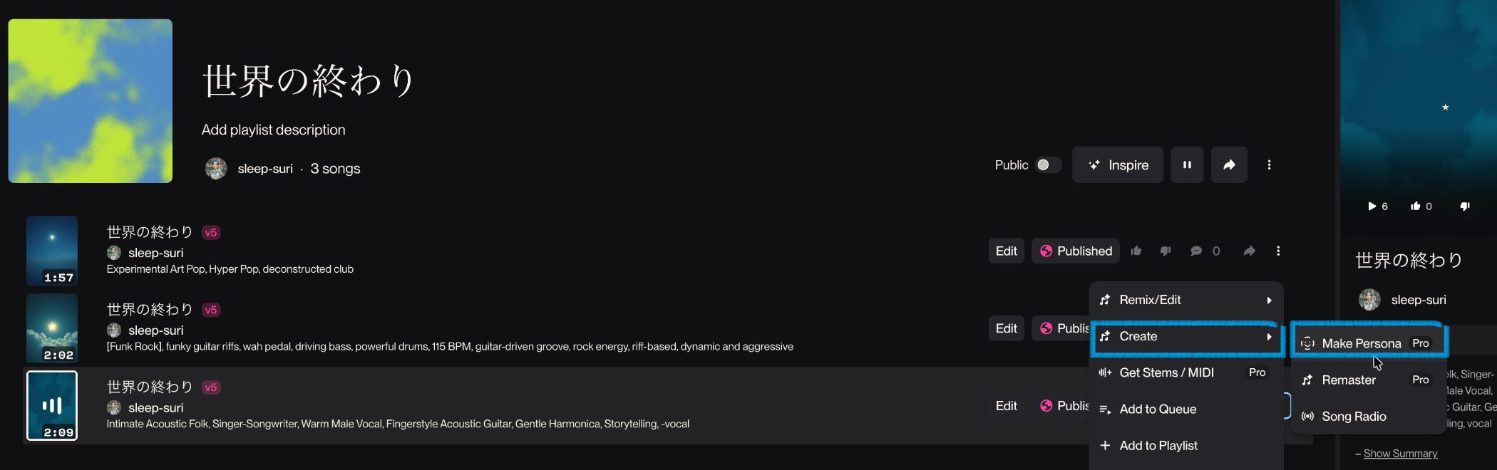 例えば、気に入った女性ボーカルの楽曲が生成されたら、その声の特徴を「Persona」として登録して生成時に呼び出すことで、”同じアーティストが歌ってる”みたいな一貫性を出せるの。