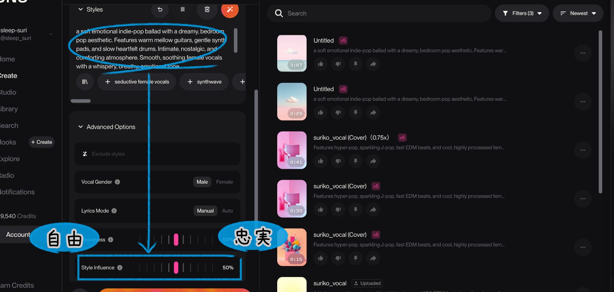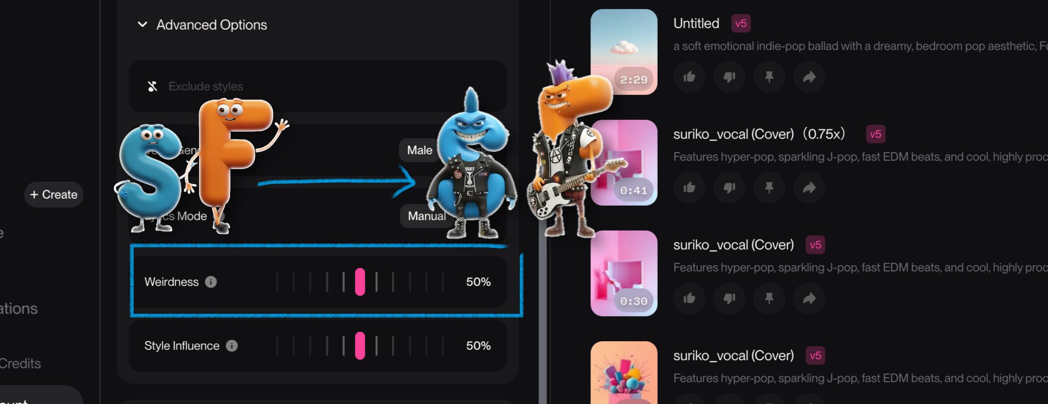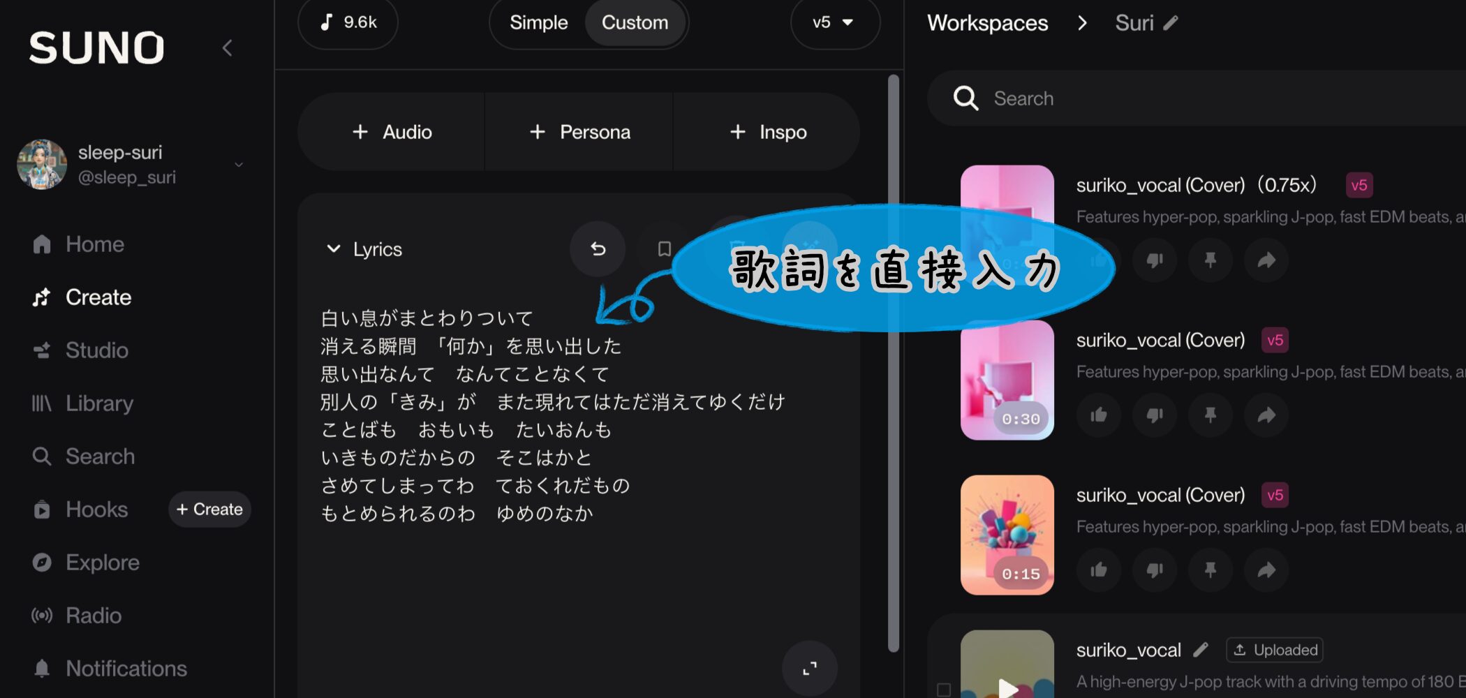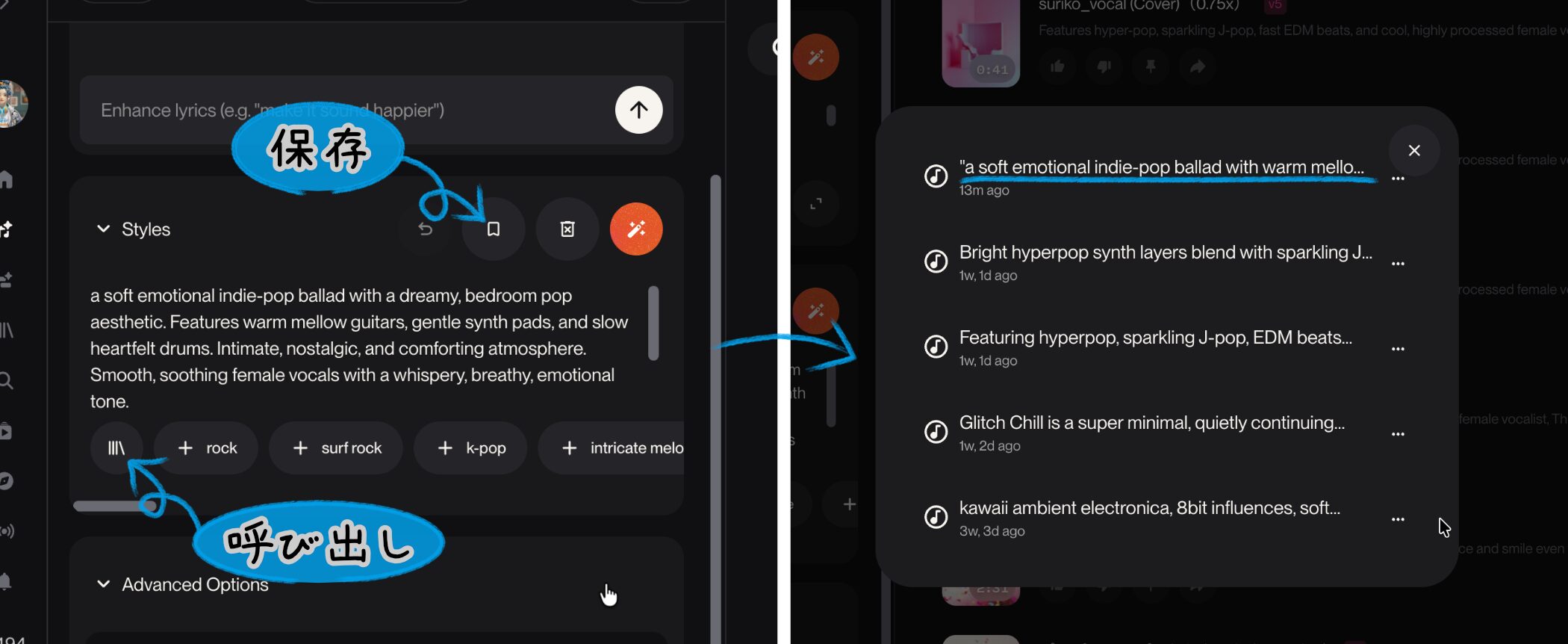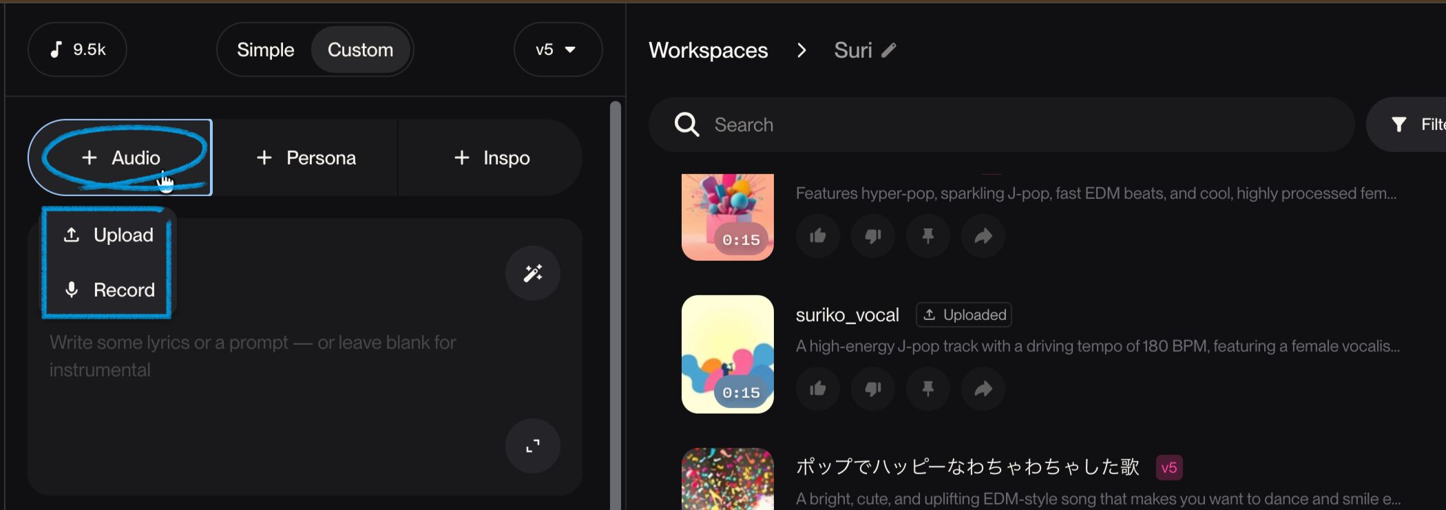 例えば、気に入った女性ボーカルの楽曲が生成されたら、その声の特徴を「Persona」として登録して生成時に呼び出すことで、”同じアーティストが歌ってる”みたいな一貫性を出せるの。
