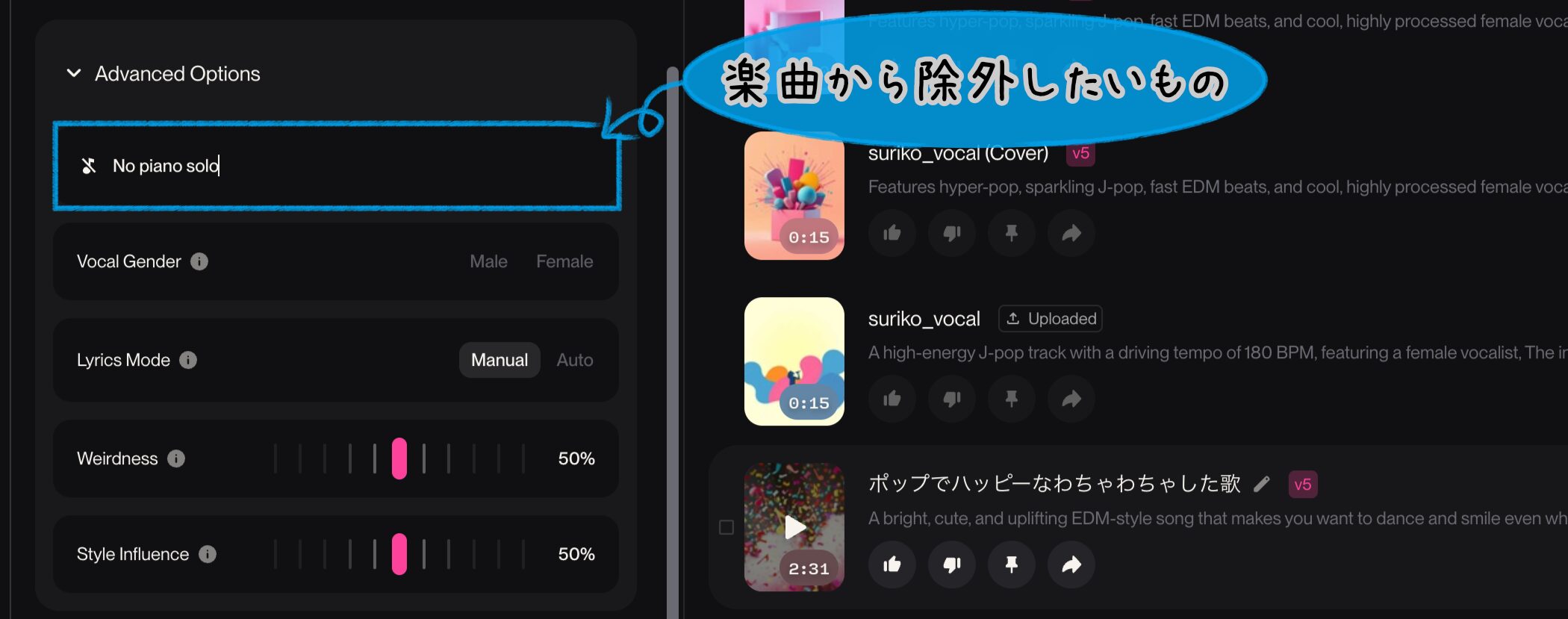 例えば、”No piano solo”って入力すれば、AIが勝手にピアノソロを入れるのを防げるよ。
