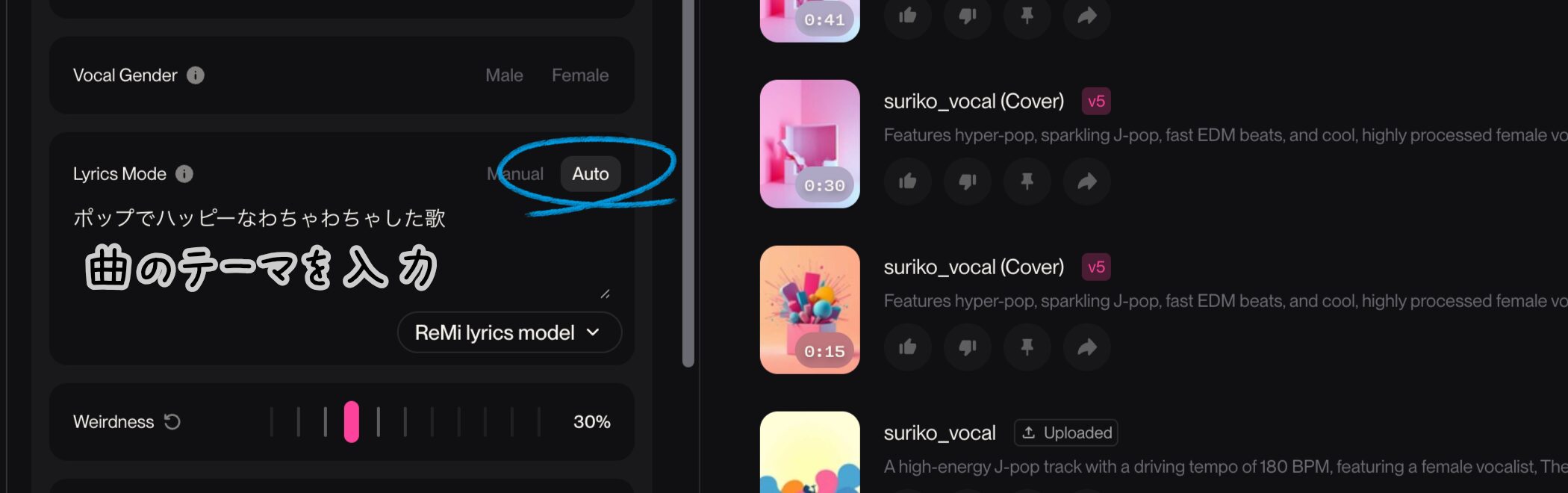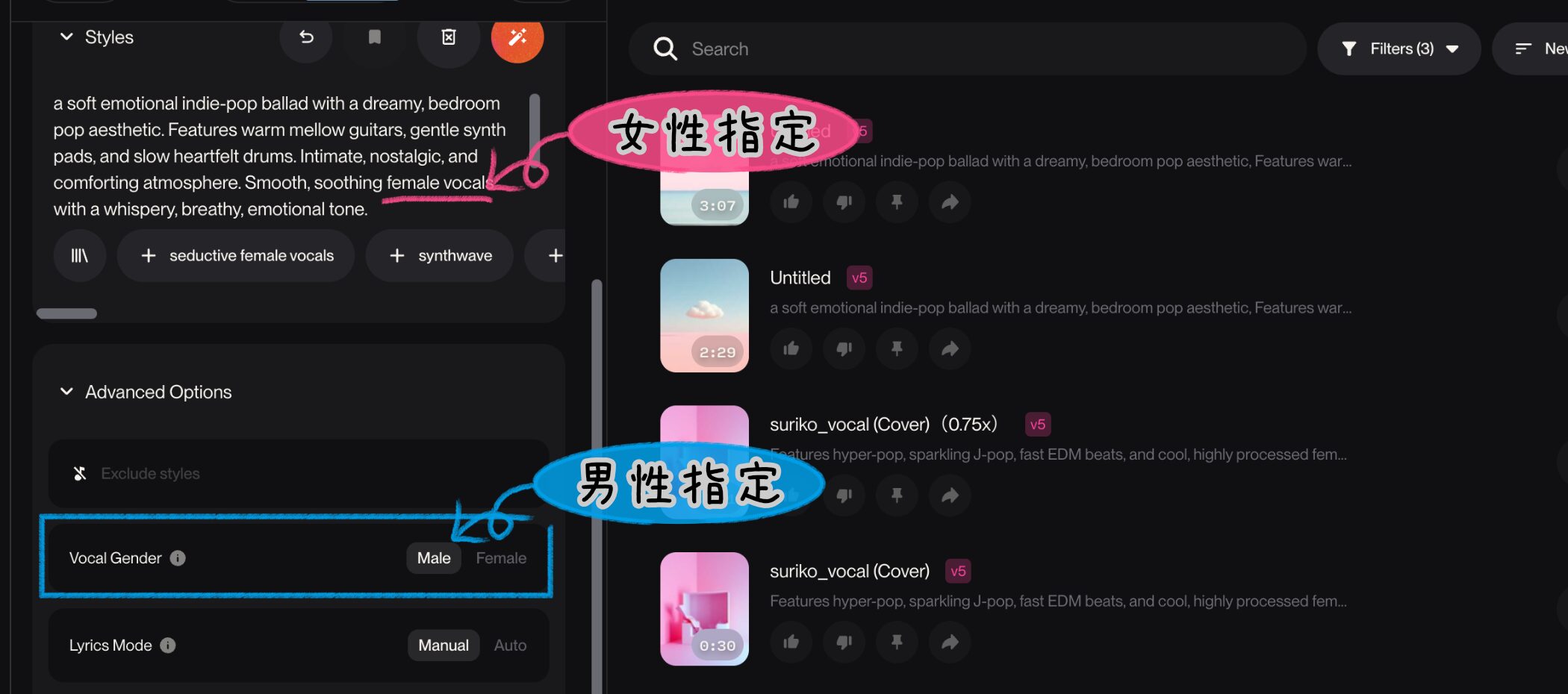 これも私がよくやりがちなんだけど、プロンプトにボーカル指定が入ってて希望した性別で生成されなかったってことにならないよう、選択時はプロンプトもチェックしてね。