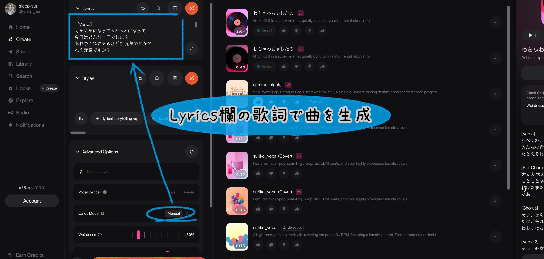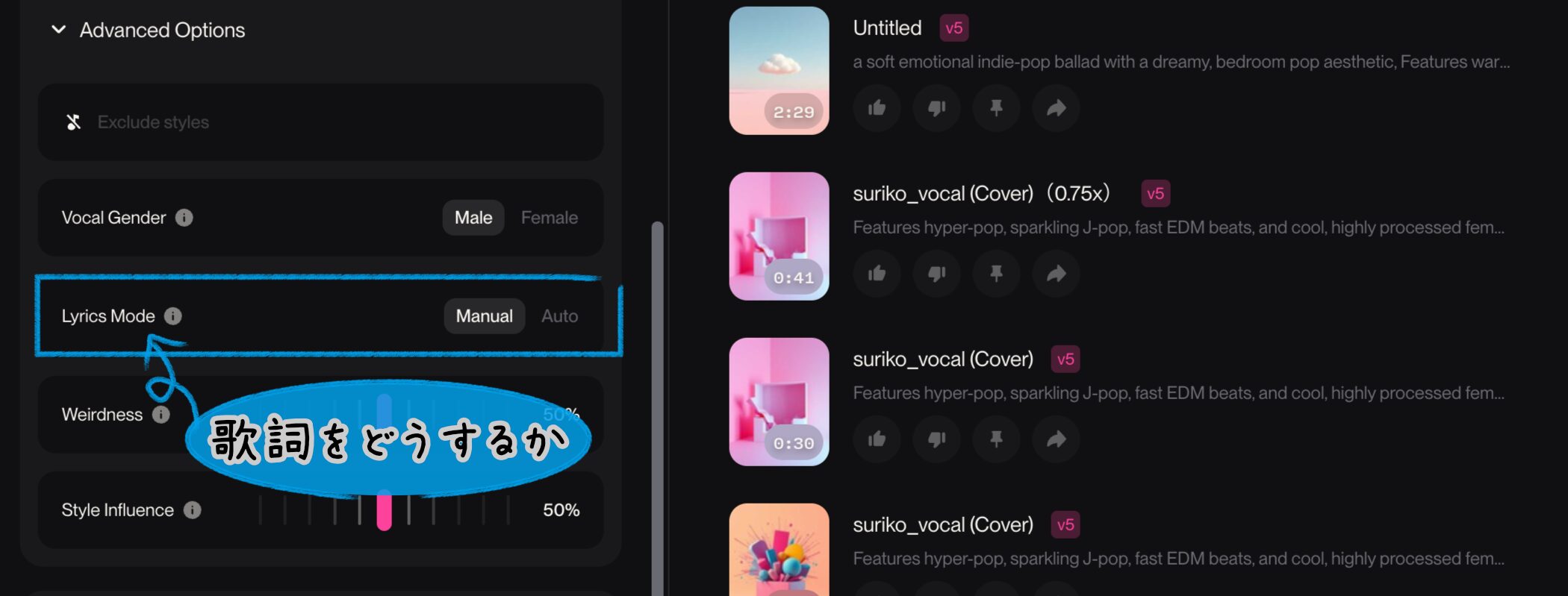 「Manual」は、Lyricsの入力欄に自分で書いた歌詞や、AIに作ってもらった歌詞をそのまま歌わせるモード。