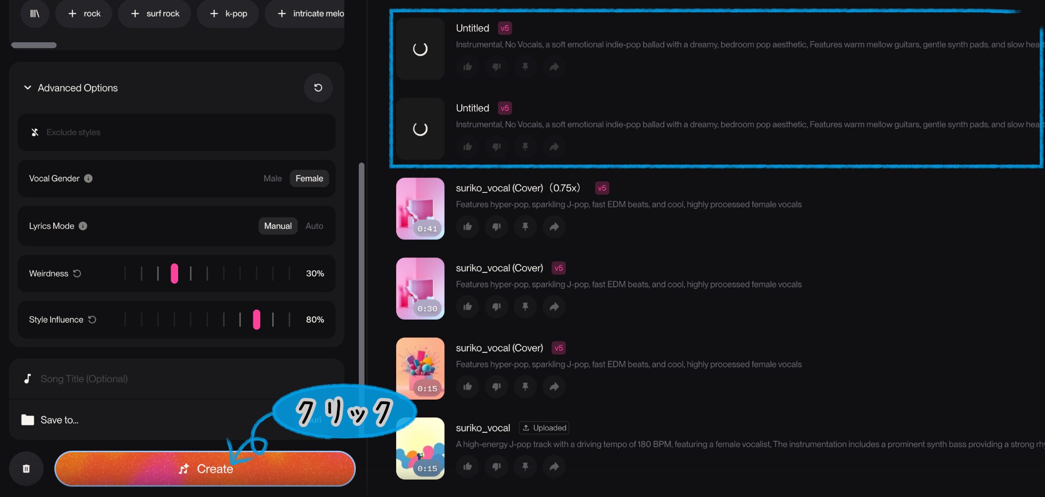 歌詞欄を空欄にしても、プロンプトに引っ張られてボーカル曲が作成される可能性があるよ。
