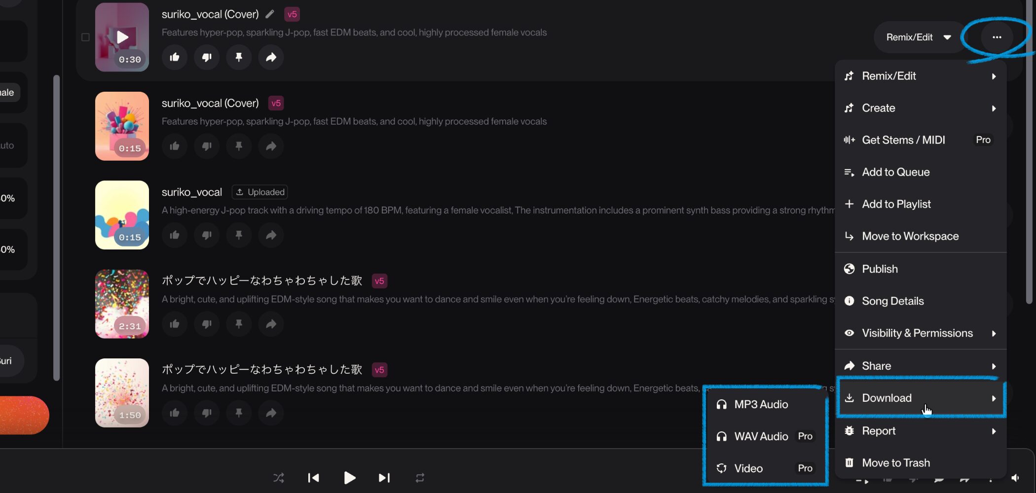 曲が気に入ったら、その曲の「…」メニュー内の「Download」から、落とすことができるよ。