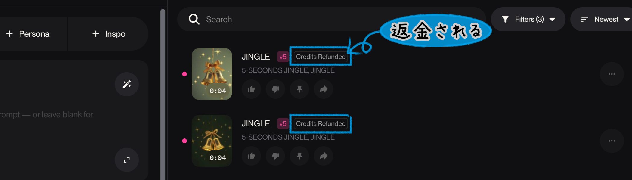 ちなみに、クレジットの話でいうと、ジングルみたいなすごく短い曲を生成しているときに、あまりに短すぎると消費したクレジットが返金されることがあるよ。