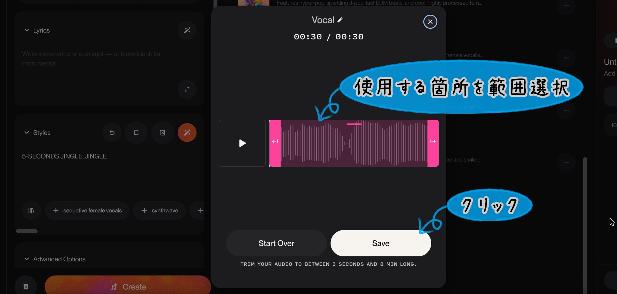 この画面で、使用したい音源の箇所を範囲で選択できるんだけど、特に指定がなかったらそのまま「Save」をクリック。
