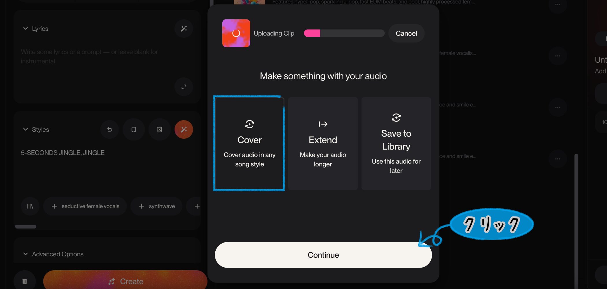 今回は、取り込んだ音源を元にアレンジして欲しいから、「Cover」を選択して「Continue」をクリック。