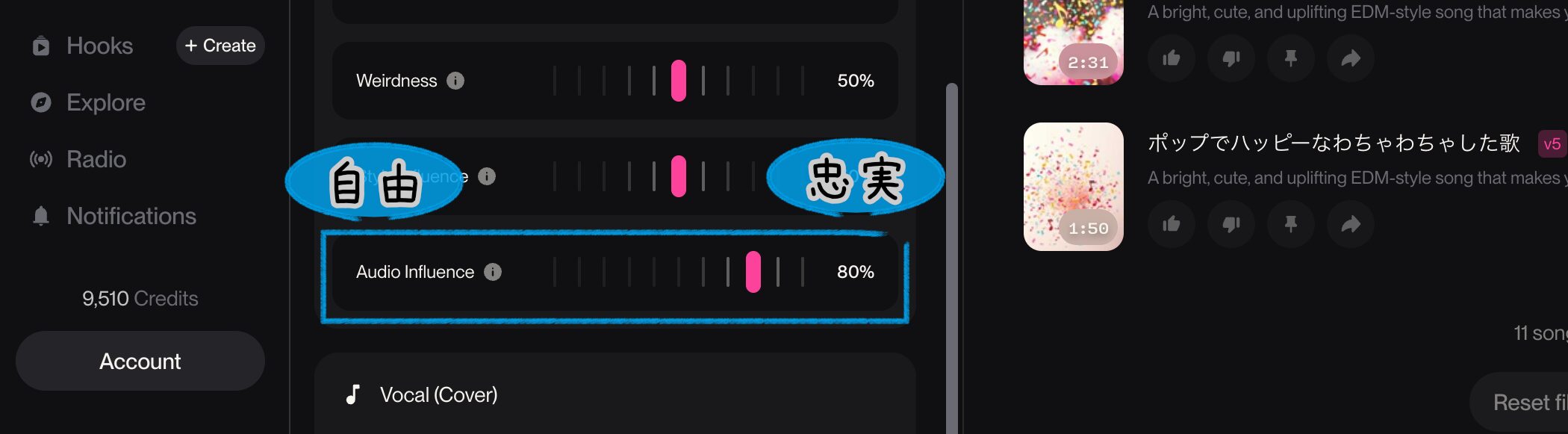 ただ、上げすぎると不自然になることもあるから、スタイルのプロンプト重視なら30〜50%、原曲の雰囲気を残したいなら60〜80%を目安に試してみてね!