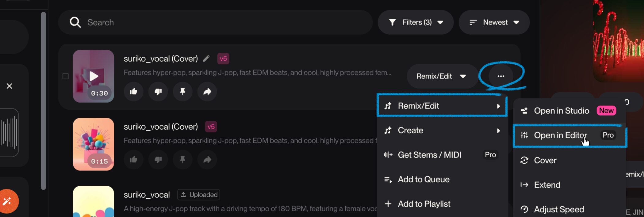 Song Editor画面は、編集したい楽曲の「…」メニューから「Remix/Edit」を選んで、「Open in Editor」をクリックすれば開くよ。