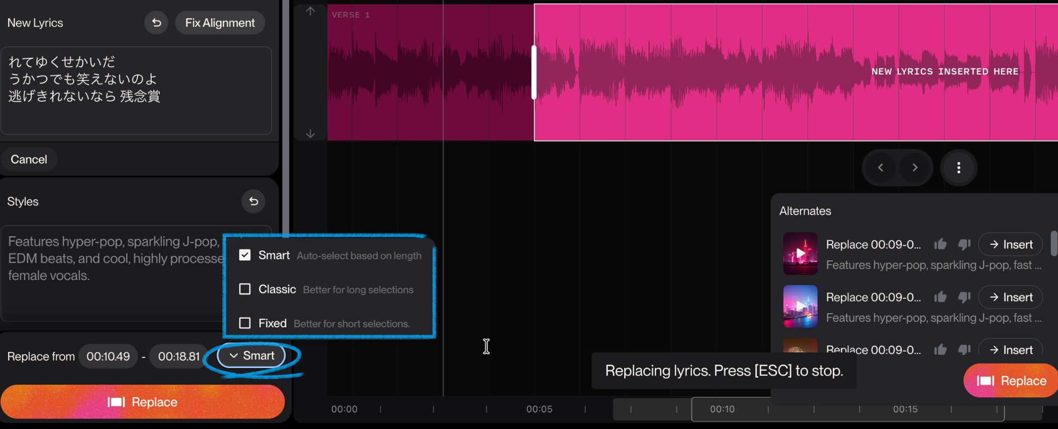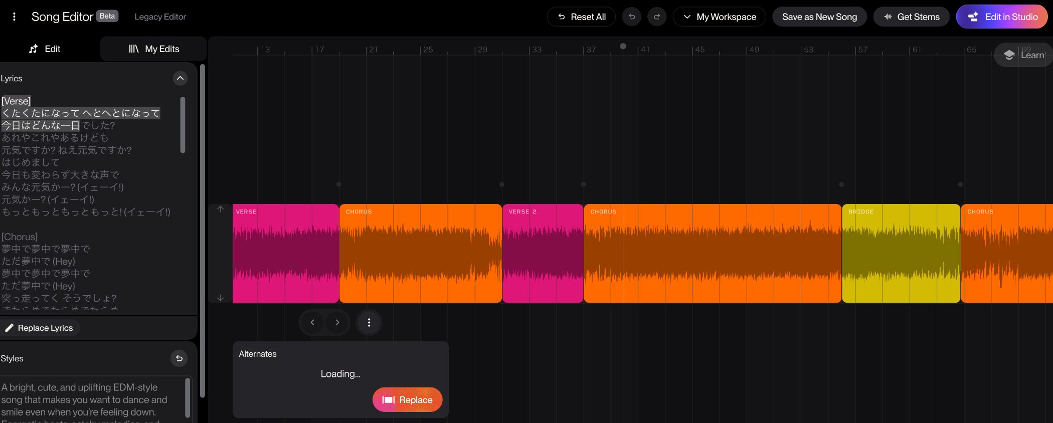 「Edit Lyrics」は、入力欄の歌詞を部分的に変更できる機能。