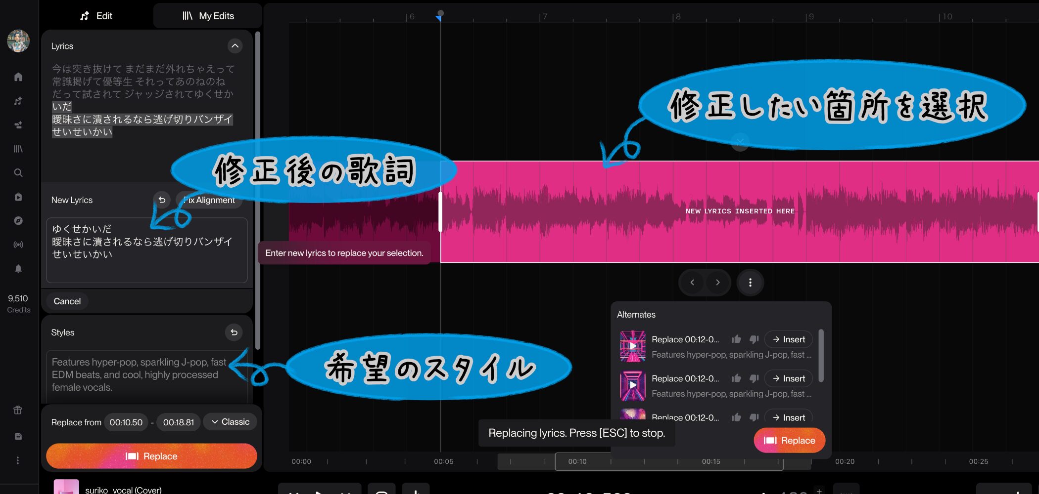 マウス操作で修正したい範囲を選択したら、左側の画面で変更したい歌詞やスタイルを入力。