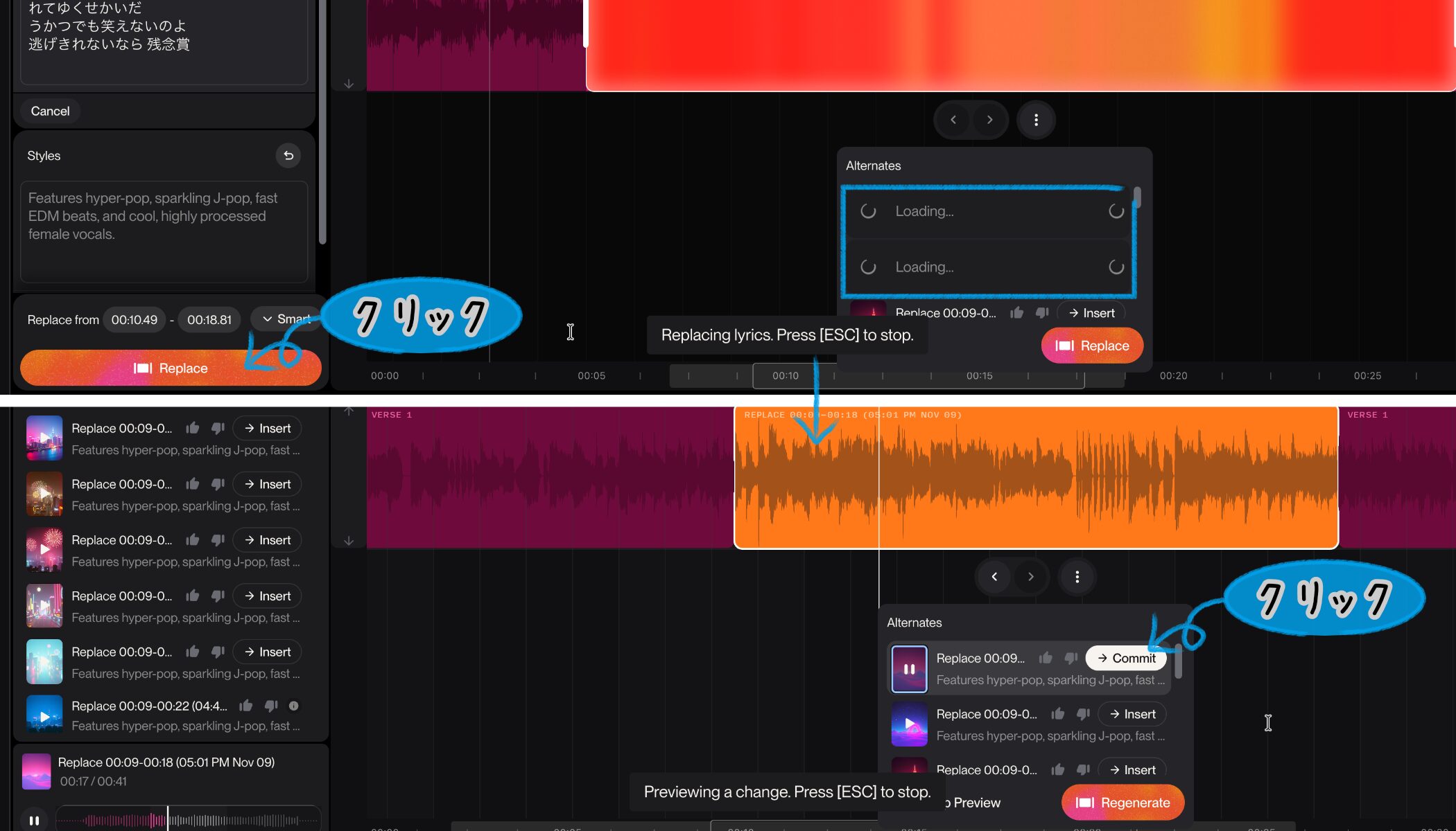 「Replace」ボタンをクリックすると、1回の生成で2パターンの修正案が生成されるから、気に入ったものを「Commit」すれば、修正が楽曲に反映されるよ!