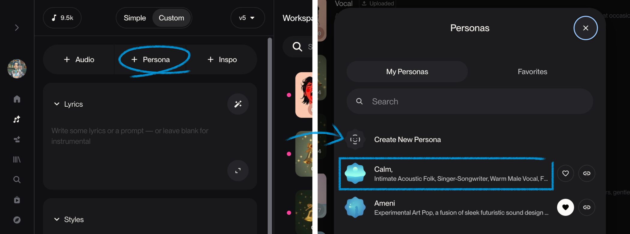 作ったPersonaは、カスタムモードで楽曲を生成するときに、「+ Persona」から使いたいPersonaを選ぶだけで自動的に反映されるよ。