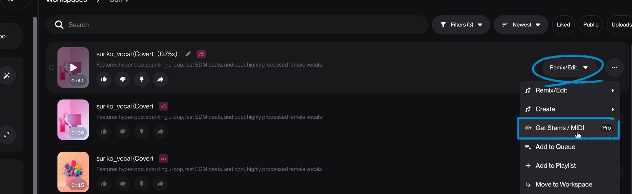 分離したい曲の「…」メニューから「Get Stems / MIDI」をクリック。