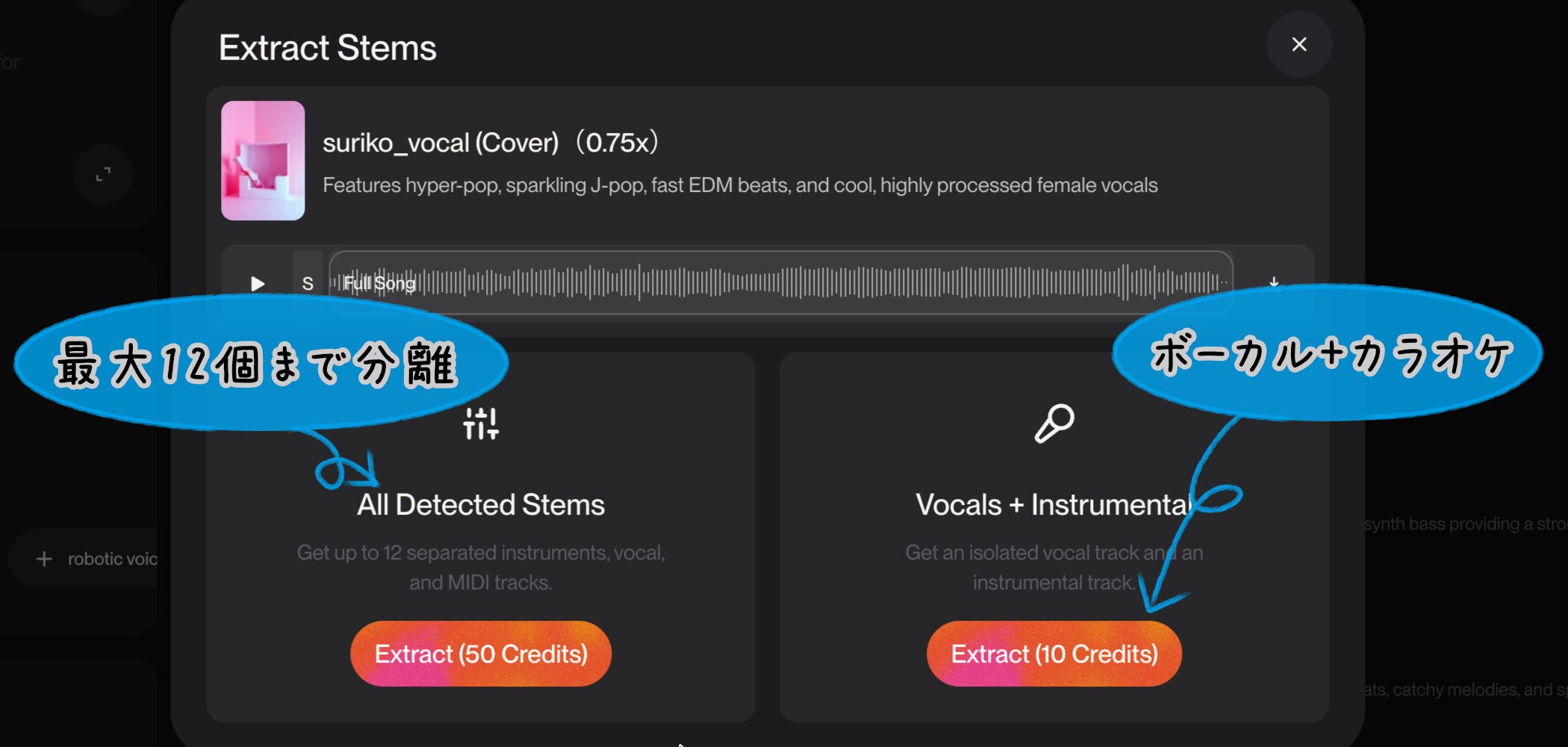 Sunoは「ステム」っていう、完成した曲をボーカルとか楽器とか、”パートごと”にバラバラに分離できる機能もあるよ。