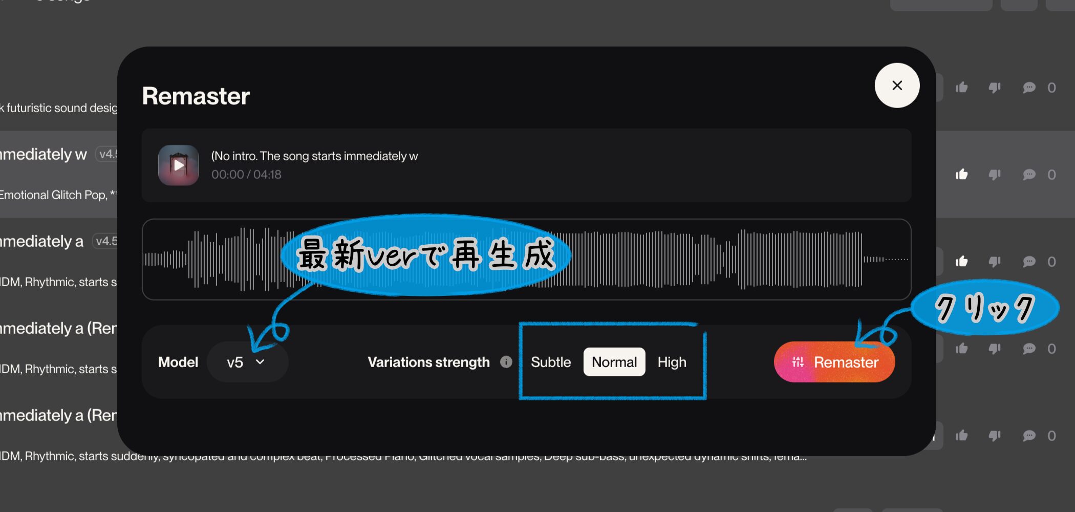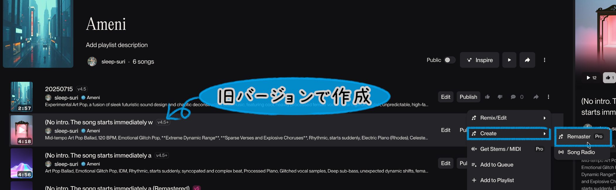 特に、「曲の構成と歌詞は気に入ってるんだけど、サウンドを良くしたい」ってときに、古いバージョンで生成した曲を新しいバージョンで再生成することができるの。