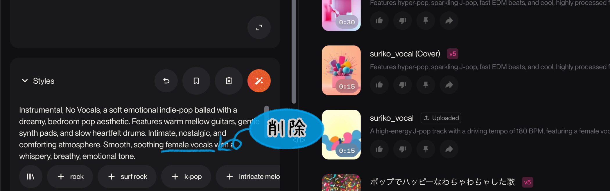 インスト曲を作成するときは、プロンプトにボーカルの指定が入っていないかもチェックしてね。