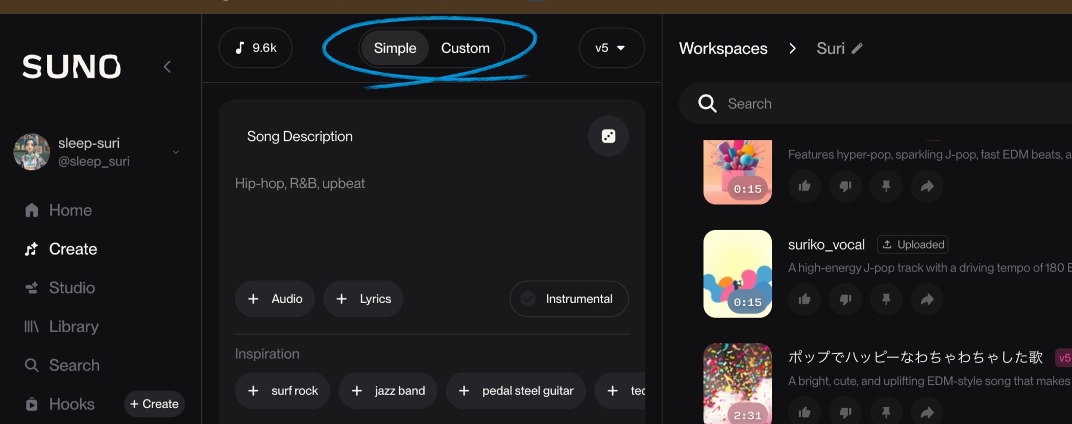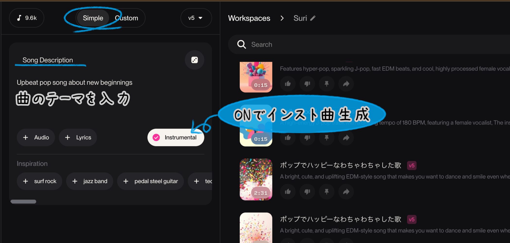 - Simple:“曲のテーマ”だけ伝えれば、歌詞も構成も全部AIにお任せできるモード