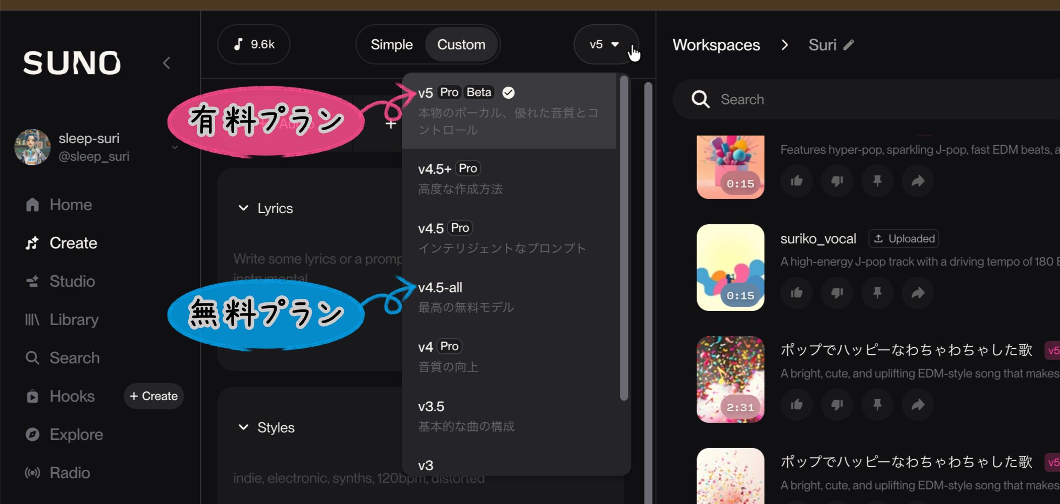 Create画面の右上に、AIモデルのバージョンを選ぶ場所があるんだけど、ここからどのバージョンで曲を作るかを選べるよ。