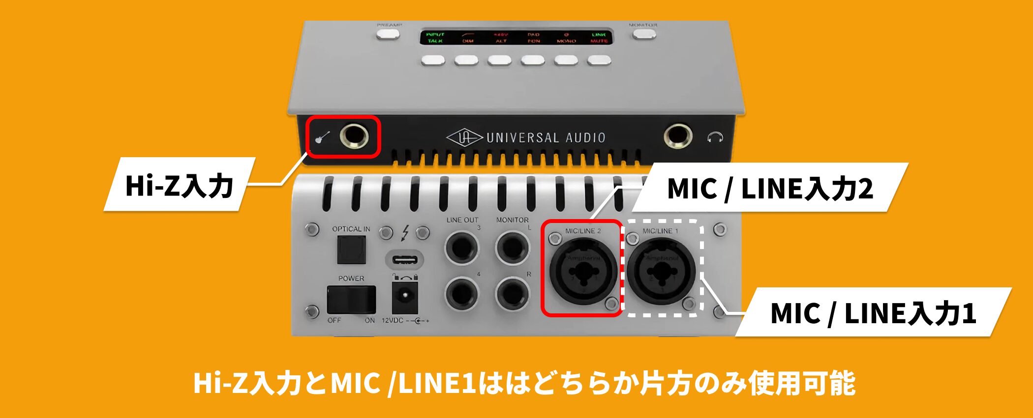 本機は10イン / 6アウト構成で、アナログ入力はフロントのHi-Zと背面のMic / LINE 1–2の計3系統、同時録音は2chまでとなります。
