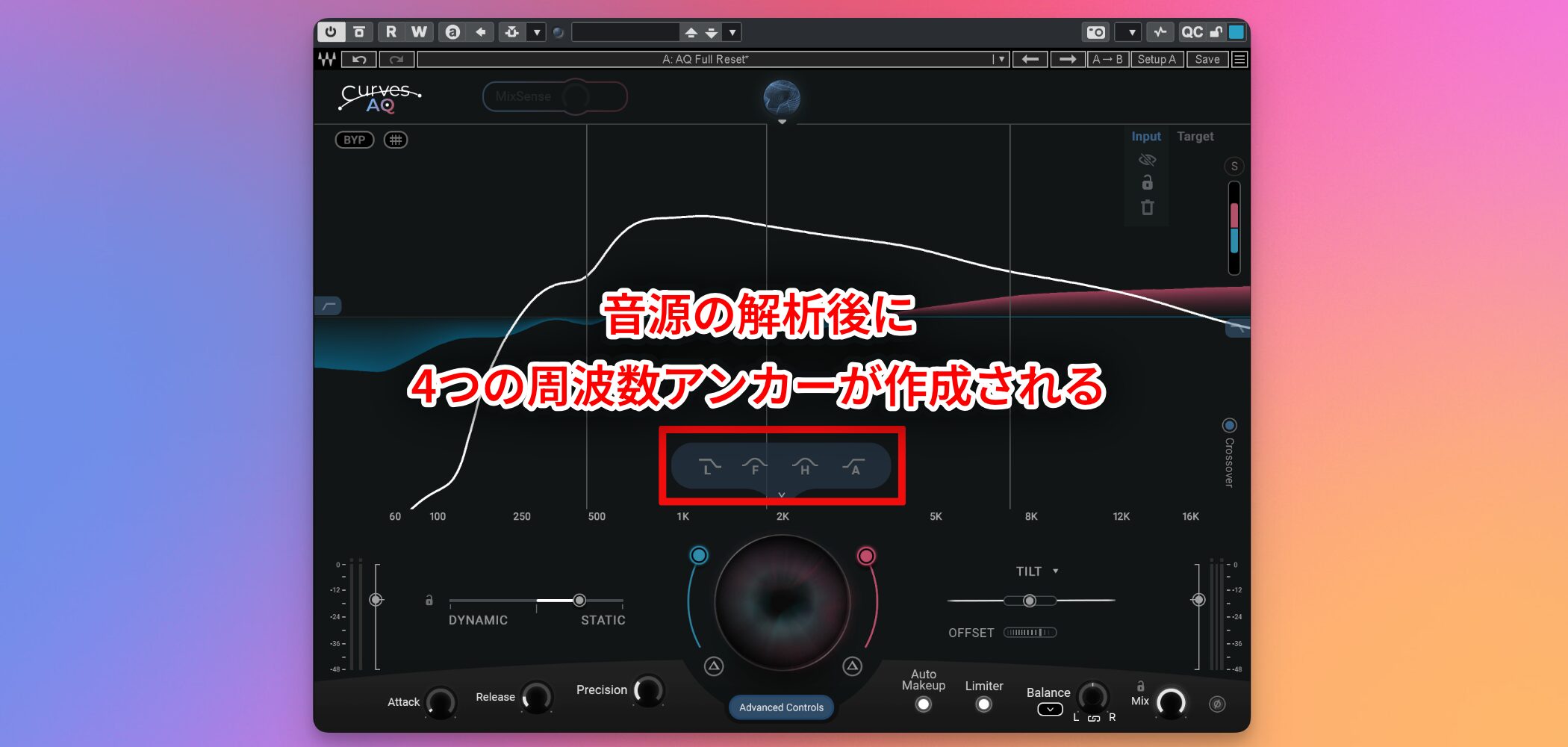 Curves AQは、音源を解析する際に、4つの重要な要素を自動的に特定し、アンカー(目印)として表示します。