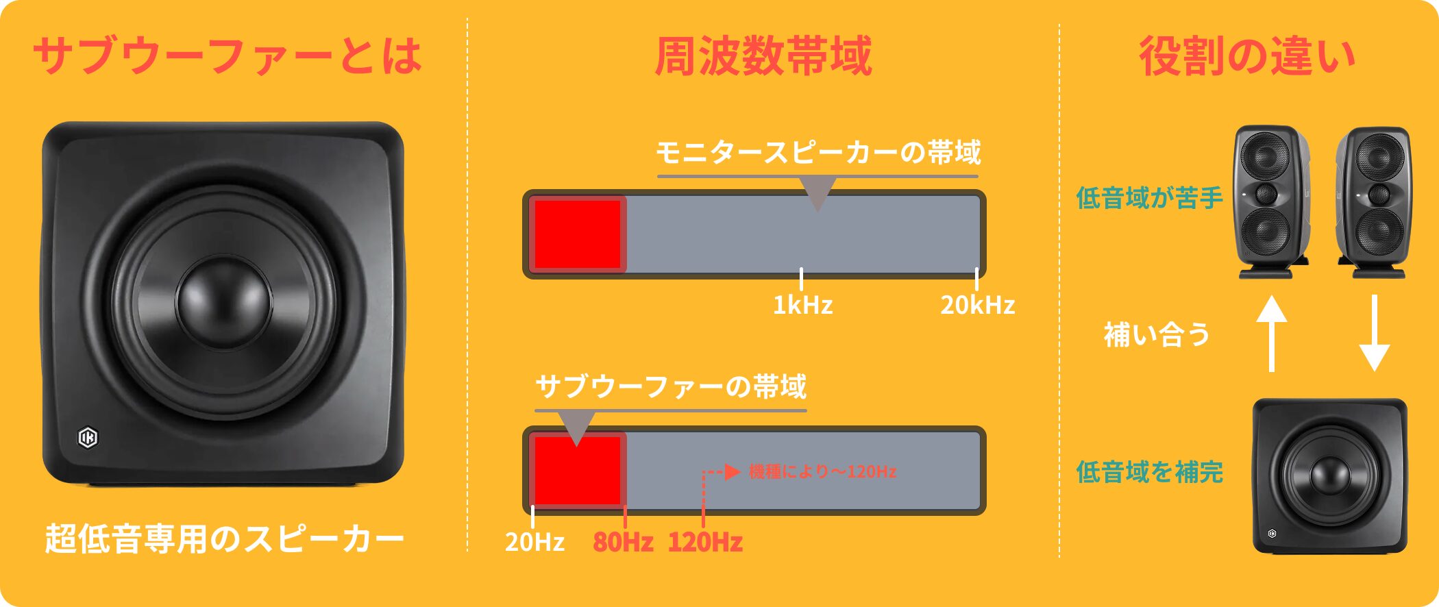 目安として20〜80Hz前後(機種によっては〜120Hz)の帯域を担当し、普通のモニタースピーカーが苦手な低い帯域を補います。