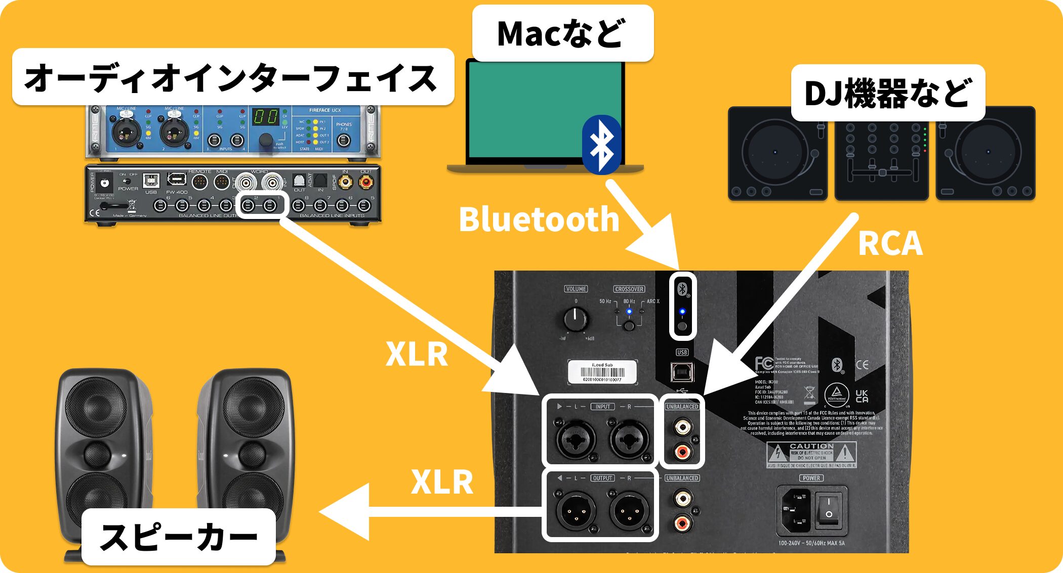 出力はXLRとRCAを備えているため、メインスピーカーへの出力もiLoud Sub経由で行えます。