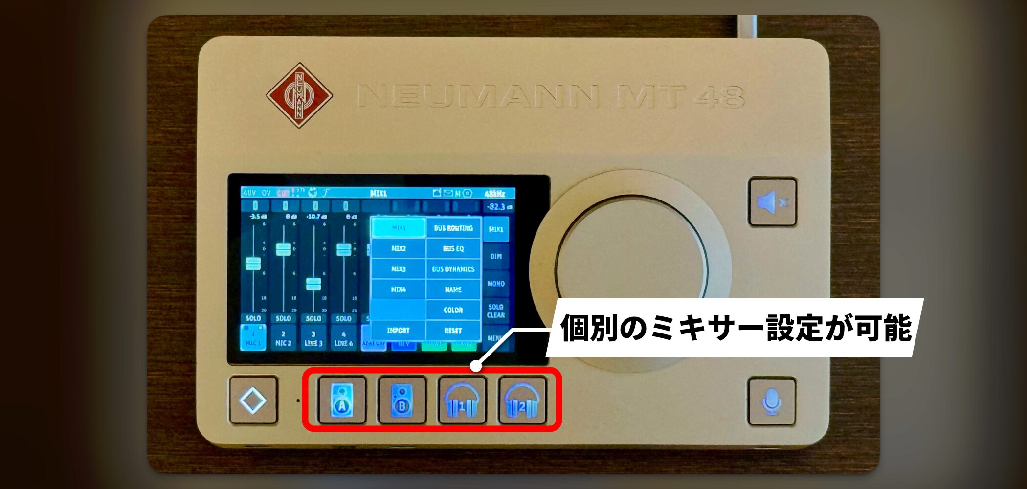 「Speakers A」「Speakers B」「Headphone 1」「Headphone 2」の4つの出力それぞれに、個別のミキサー設定が可能です。
