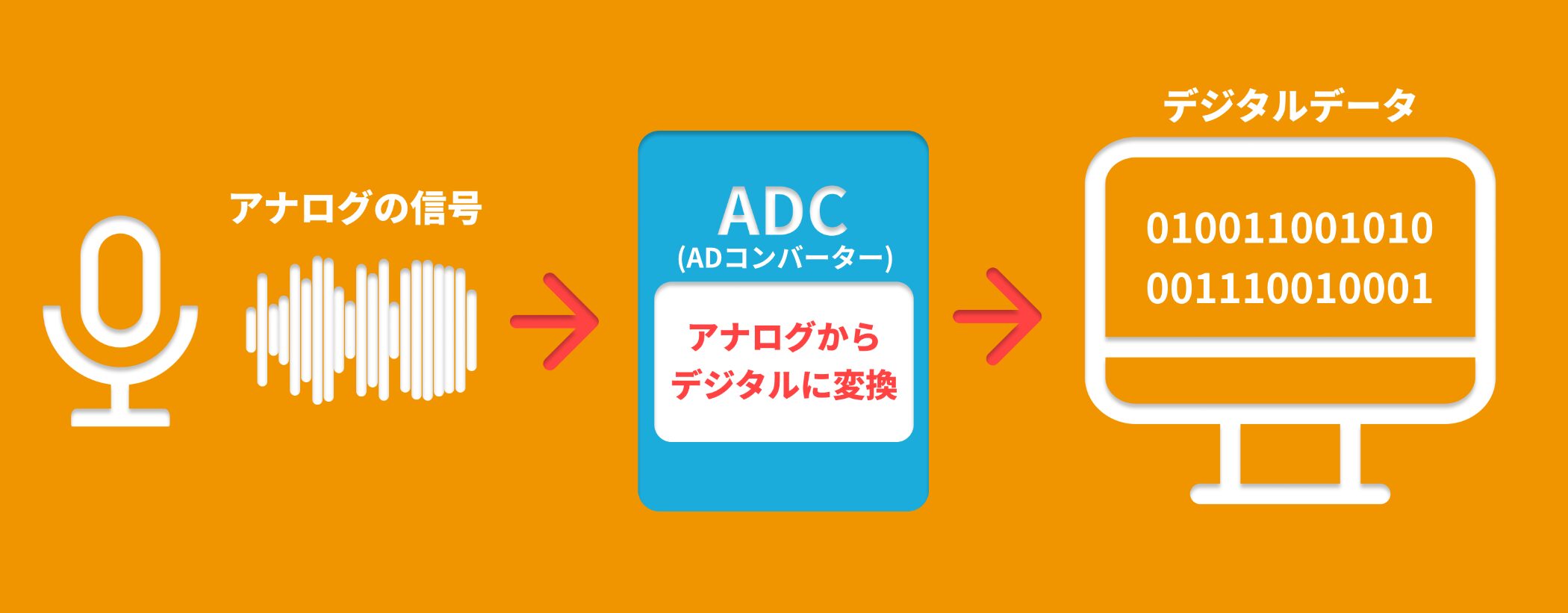 ADコンバーターとは、マイクや楽器の音(アナログ信号)を、PCで扱えるデータ(デジタル信号)に変換する部分です。