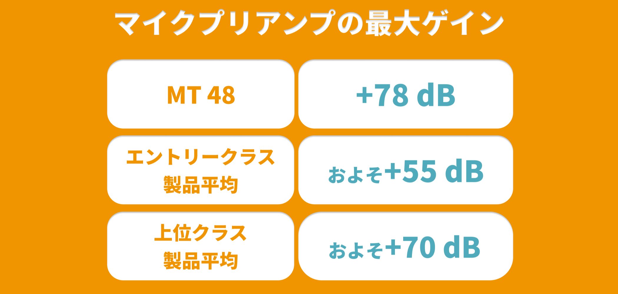 一般的なインターフェースの最大ゲイン(増幅できるパワー)が50dB台後半であるのに対し、MT 48は最大78dBのクリーンなゲインを提供します。