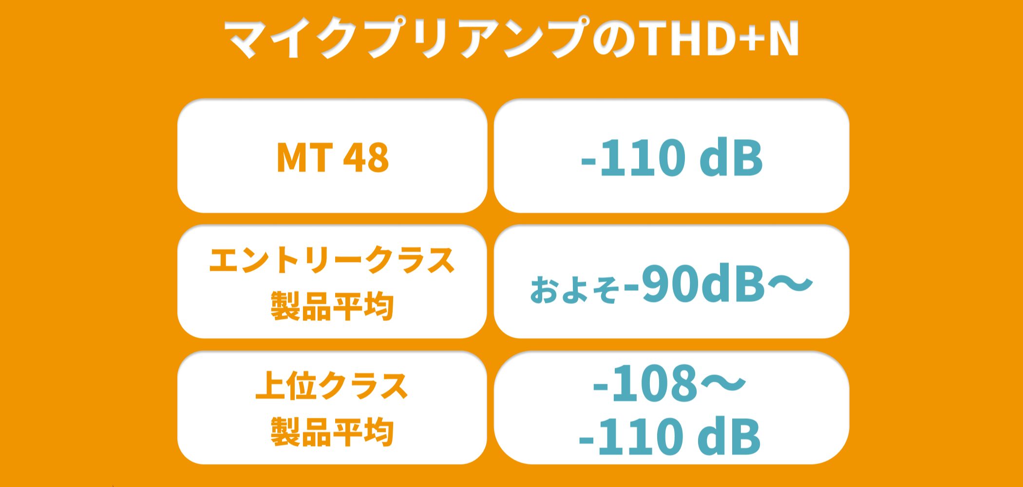 さらに、音のクリアさを示す「THD+N(全高調波歪み率+ノイズ)」という指標でも、MT 48は-110dBという優れた性能を記録。