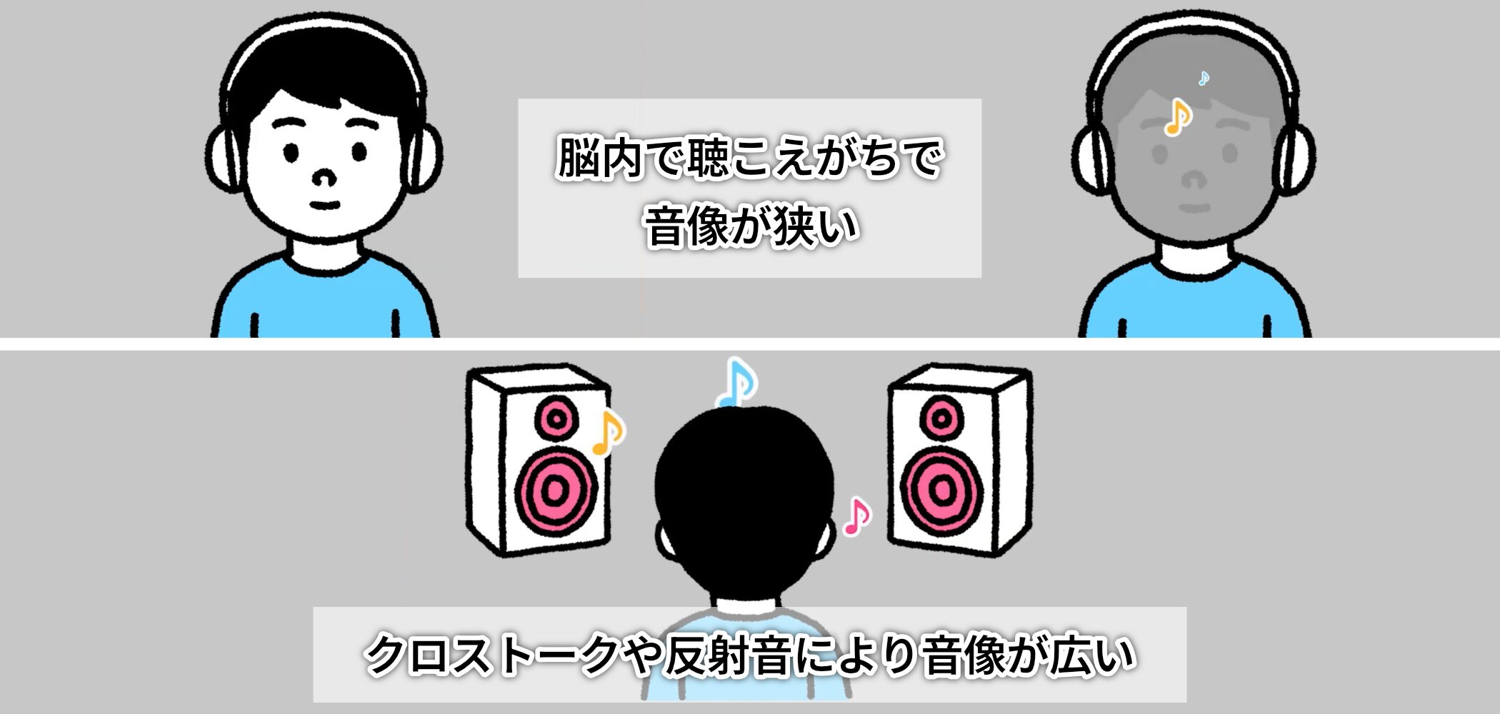 それは、スピーカーでは自然に発生するクロストーク(左スピーカーの音が右耳にも届く現象)や、部屋の反射音による空気感や奥行き感をヘッドホンで再現するのが困難だったためです。