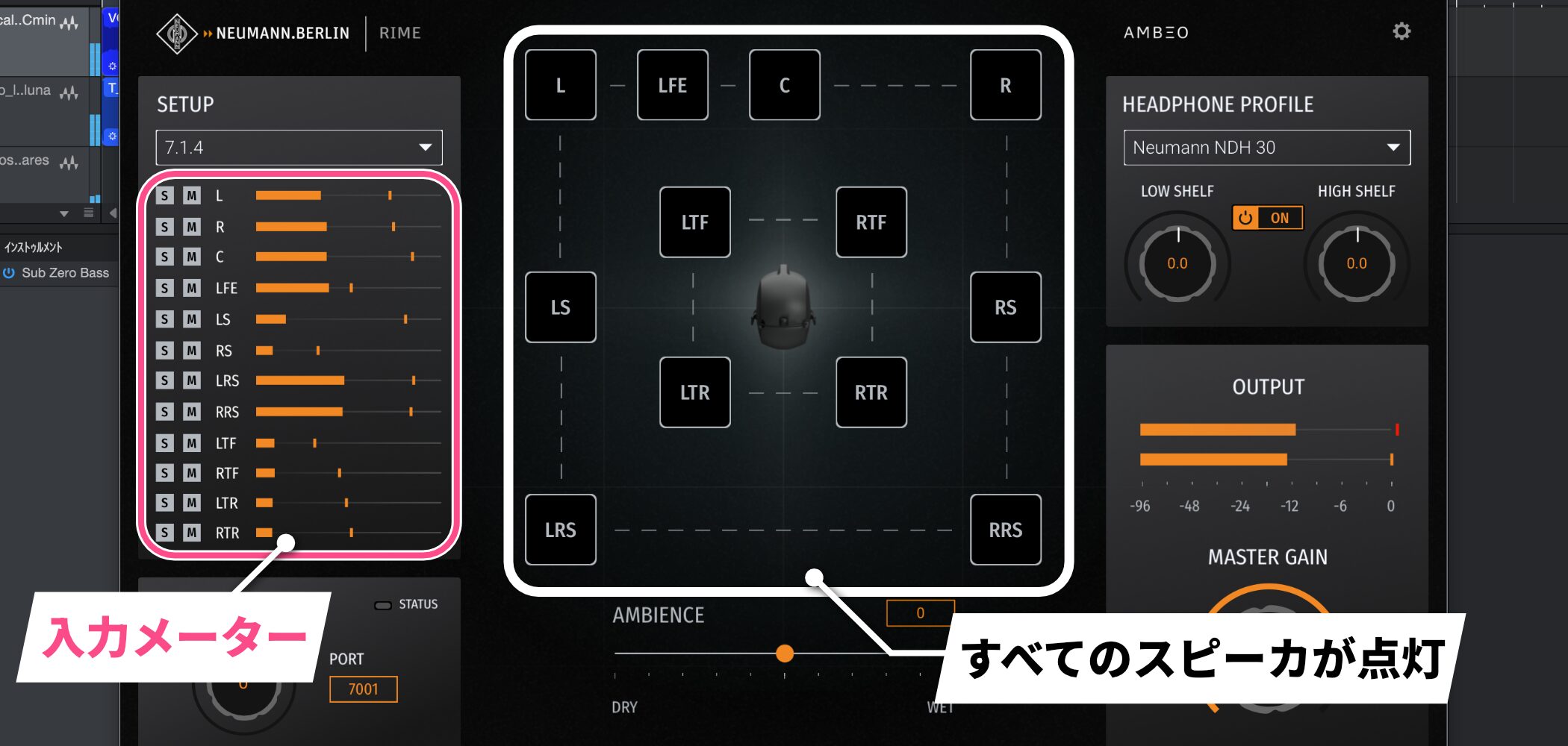 すると、画面中央のスピーカーコントロールエリアで、すべてのスピーカーが点灯し、各チャンネルの入力メーターも確認できるようになります。