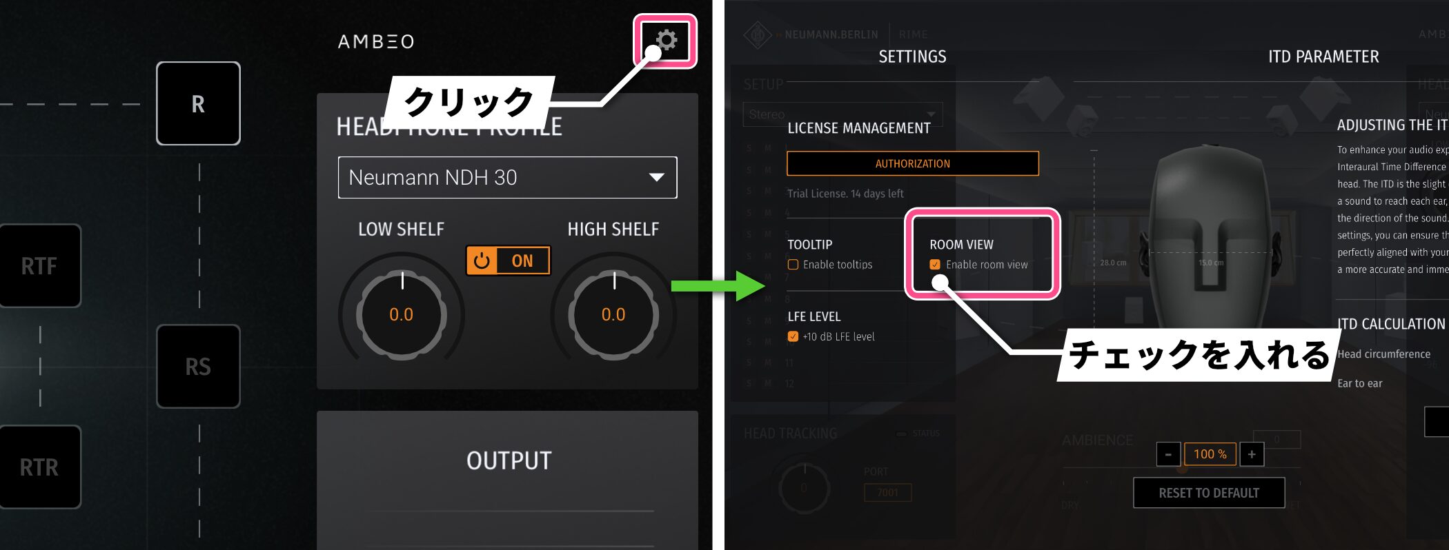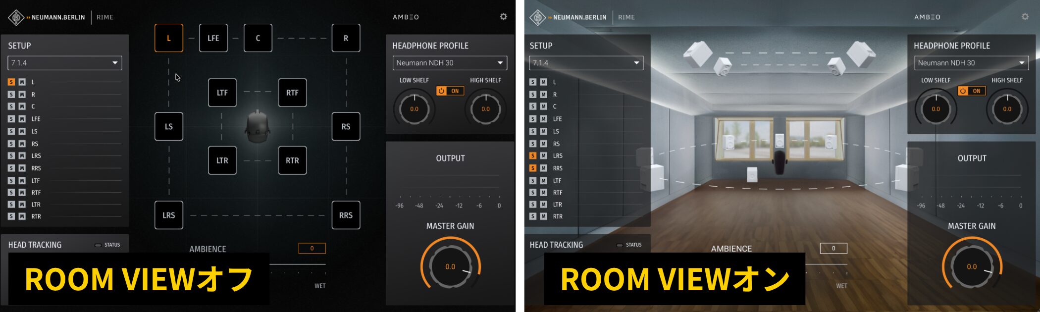 設定画面の「ROOM VIEW」チェックボックスにチェックを入れると、ノイマンスタジオの3D環境を表示できます。