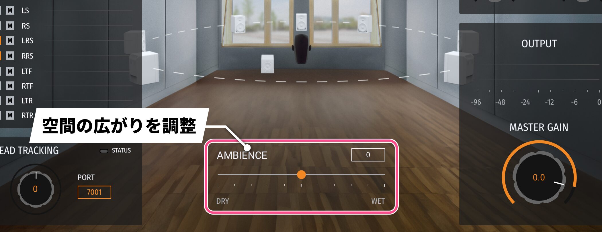 スピーカーコントロールセクションの下部にある「AMBIENCE」ノブにより、ドライからウェットまで空間の広がりを調整できます。