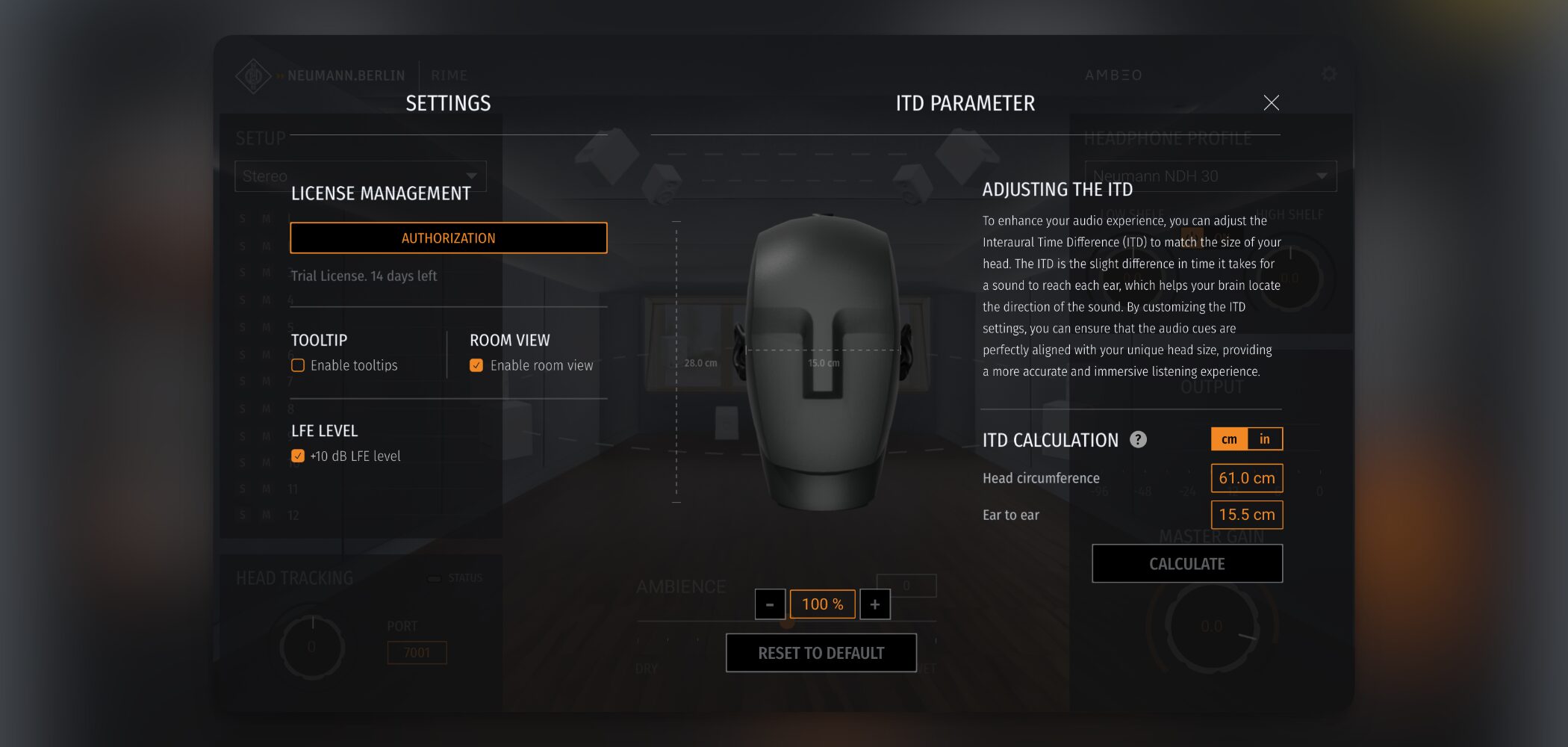 「ITD CALCULATION」セクションでは、頭囲(Head circumference)と耳間距離(Ear to ear)を入力できます。