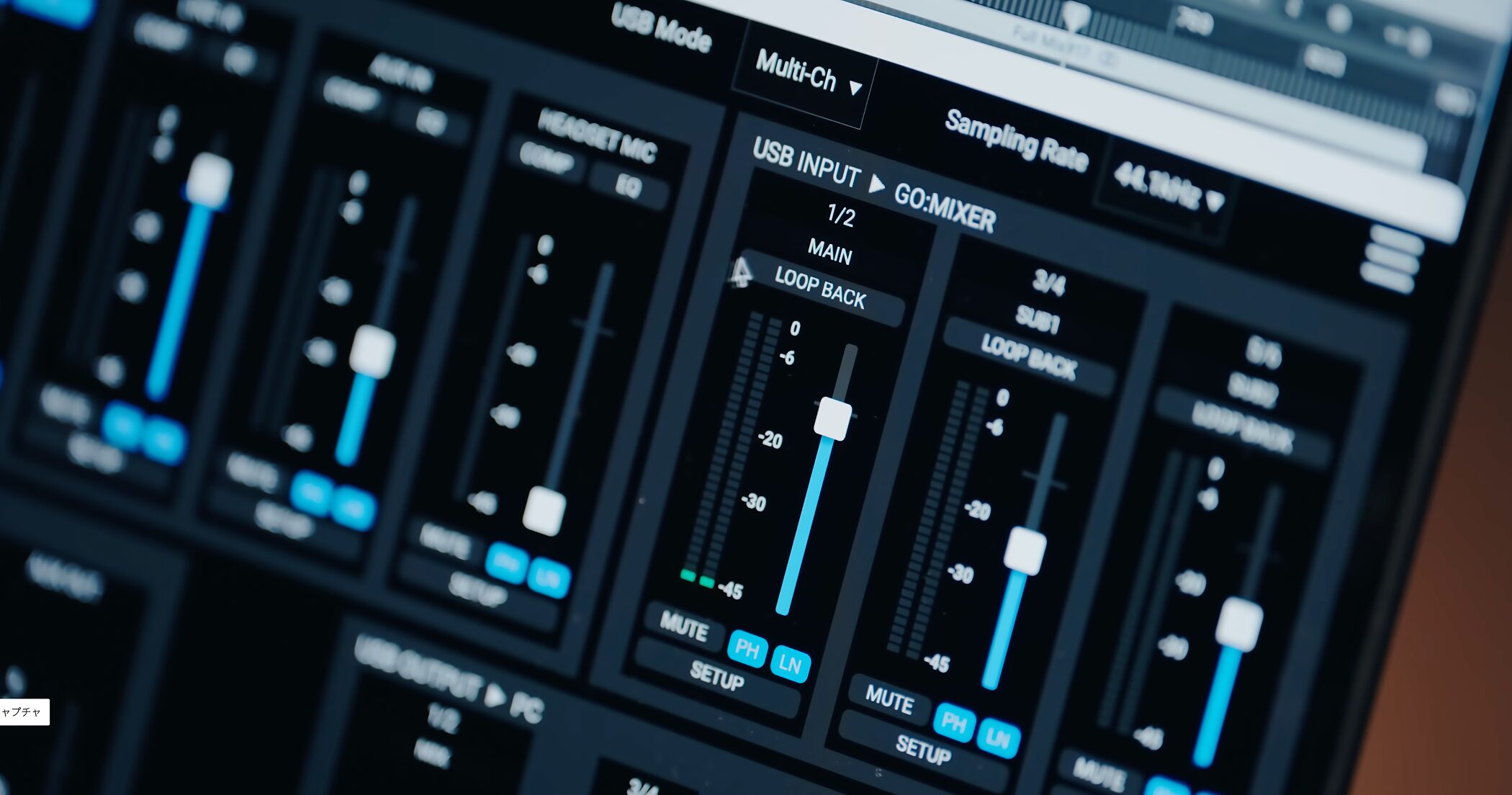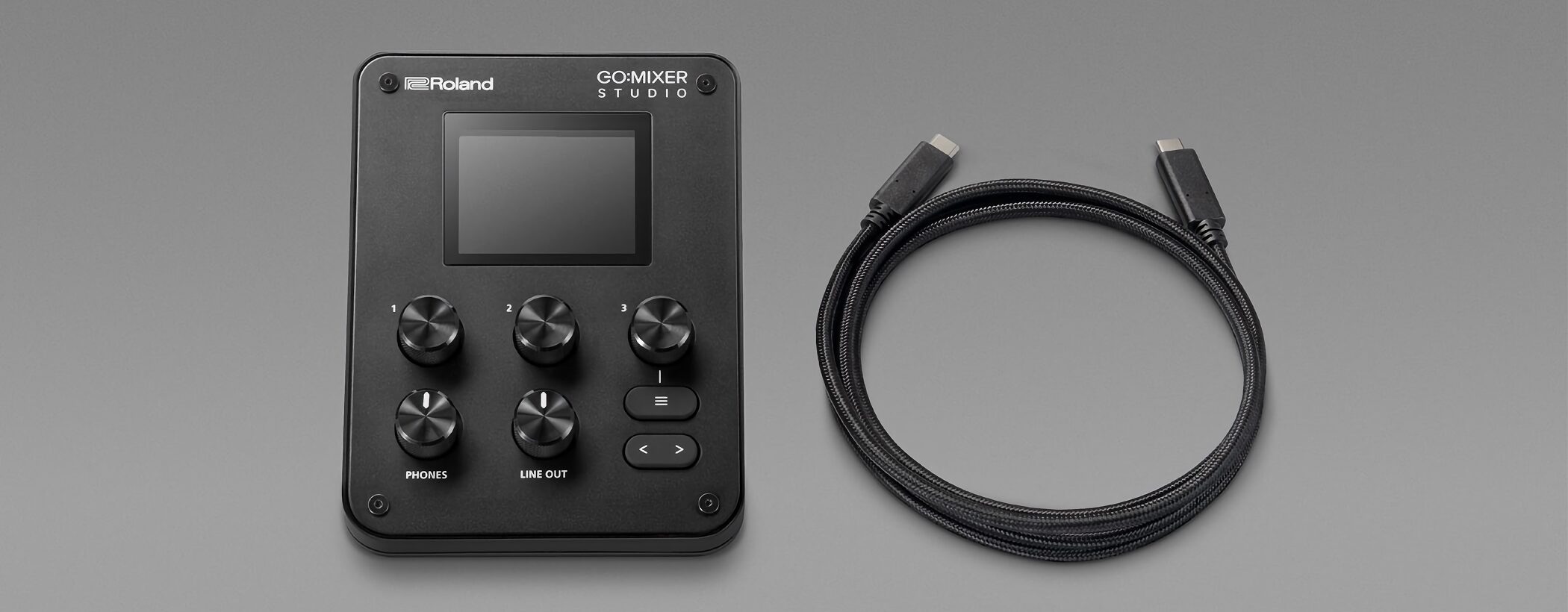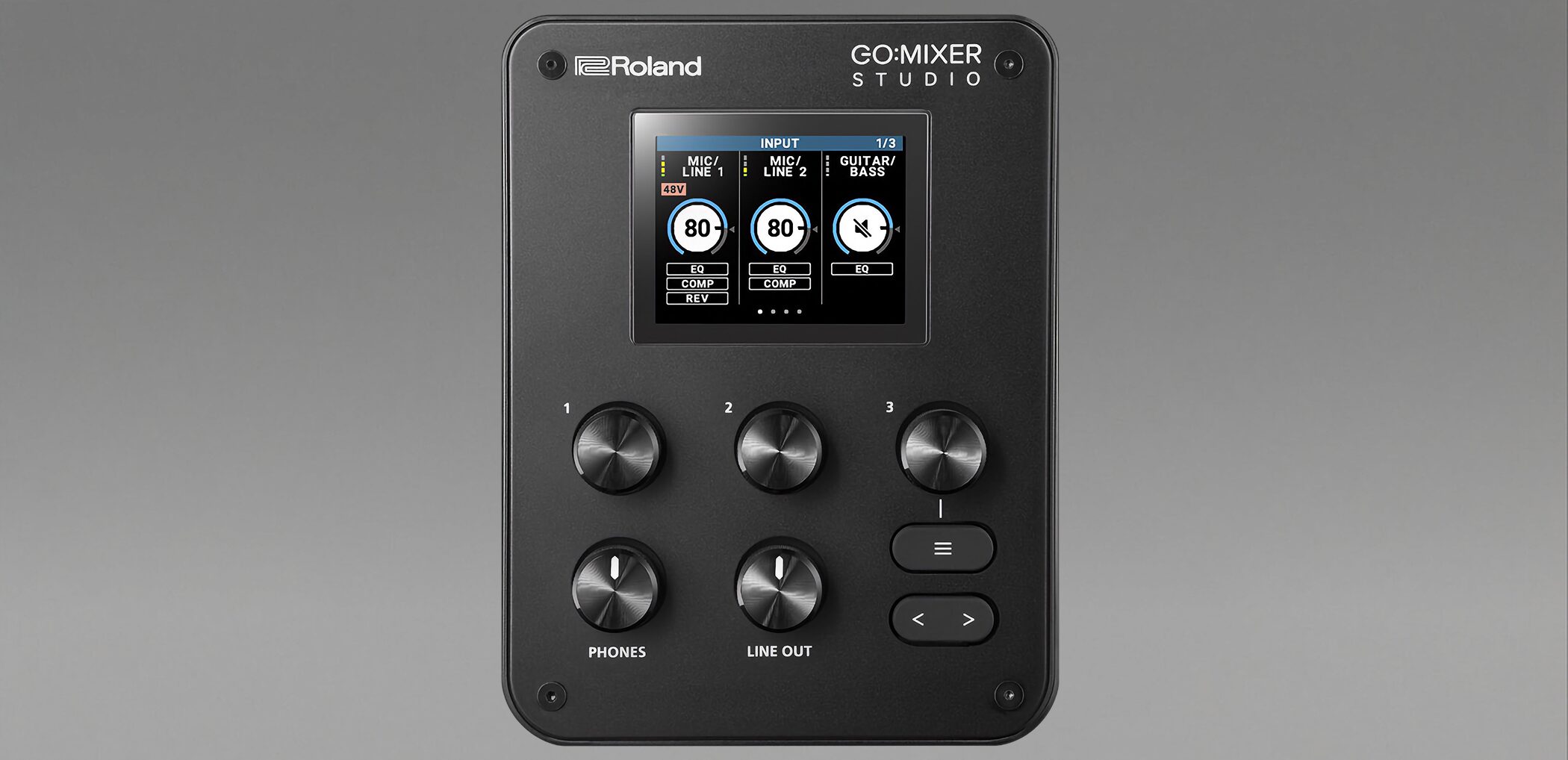 小型のミキサーは操作性が課題になりがちですが、GO:MIXER STUDIOはディスプレイと3ノブによる直感的な操作を実現しています。